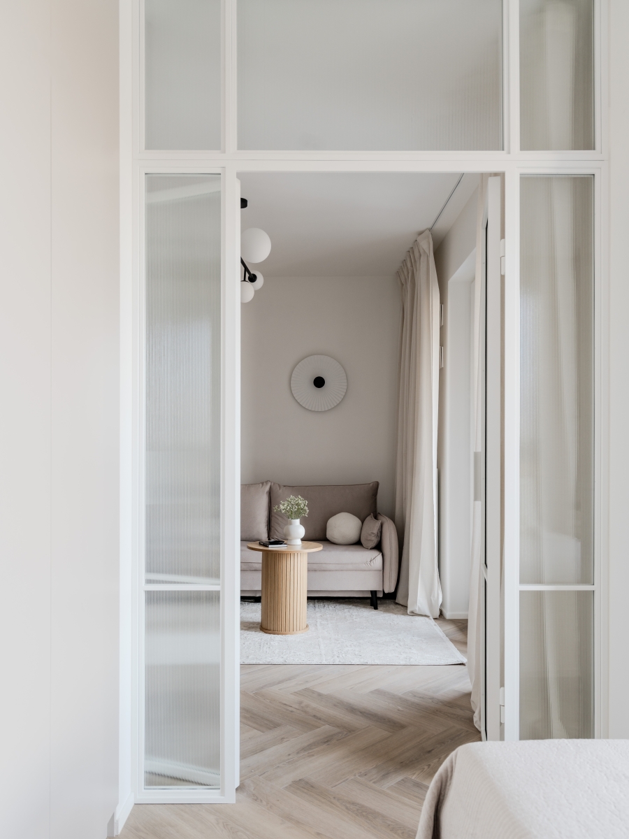 Na całość składa się niewielki hol z pojemną szafą wnękową, salon z aneksem kuchennym, sypialnia oraz łazienka, do której prowadzą drzwi ukryte. Głównym elementem dekoracyjnym, który nie tylko nadaje charakter, ale i poprawia funkcjonalność – jest przepuszczająca światło ścianka w konstrukcji stalowej z dwuskrzydłowymi drzwiami wypełniona ryflowanym szkłem. – Można było wymurować ścianę w otwartej przestrzeni. Ale to rozwiązanie powoduje, że przestrzeń odbieramy jako otwartą, a równocześnie zyskujemy możliwość czasowego odseparowania stref sypialni i salonu – wyjaśnia architektka. Ściana szkła wnosi wizualny „oddech”, a proporcje optycznie podnoszą wysokość wnętrza – subtelne nawiązanie do wnętrz kamienic, z których słynie Łódź. Podobne jak delikatnie usłojona podłoga – z winylu do złudzenia przypominającego drewno – ułożona we wzór klasycznej jodełki.