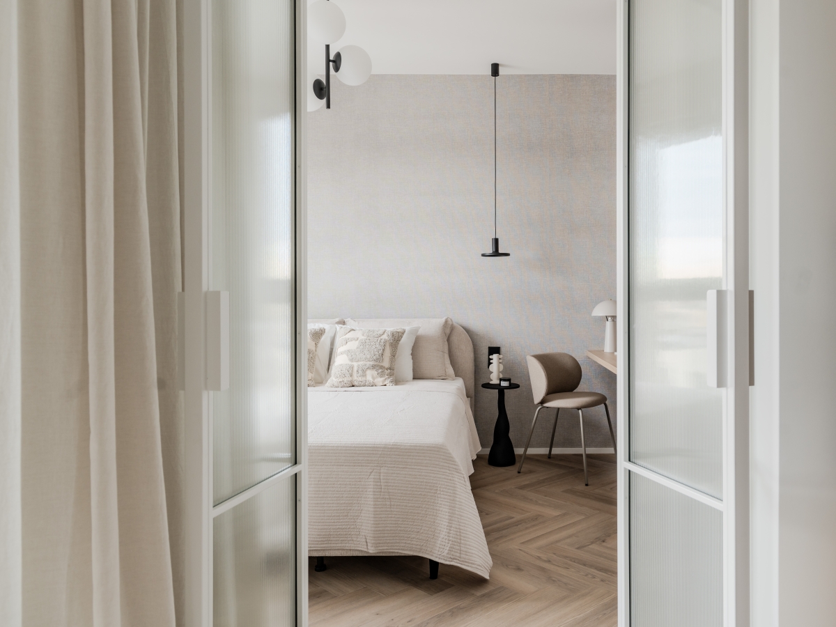 W uspokojonej, wyciszonej kolorystycznie przestrzeni przewija się delikatny, ale czytelny, motyw graficzny. Czarne akcenty, jedyne tak wyraziste w stonowanym wnętrzu, stanowią detale w postaci form oświetlenia oraz drobnych elementów meblowych przy łóżkach. To właśnie ta czerń ożywia kojące, przesycona światłem wnętrze. Nie odbierając mu charakteru spokojnego, powściągliwego tła dla życia i osobistych obiektów, które wprowadzą się tutaj wraz z najemcą.