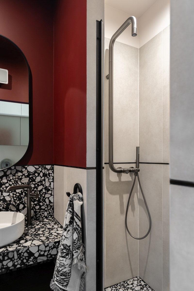 Istotnym elementem tej przestrzeni jest armatura z serii Silia marki Deante Design Studio. Deszczownica i bateria umywalkowa tworzą spójną, konsekwentną całość, wpisując się w założenie eleganckiego minimalizmu. Opływowe formy oparte na motywie wygiętej rury oraz ręcznie dopracowane detale nadają armaturze miękkości, a wykończenie titanium subtelnie koresponduje z bordową kolorystyką wnętrza. Forma deszczownicy przyciąga uwagę i staje się jednym z rozpoznawalnych elementów łazienki, wprowadzając do wnętrza miękkość i nowoczesny sznyt.
