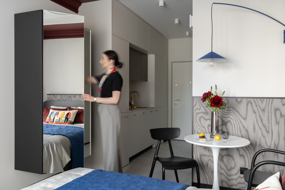 Już na etapie koncepcji inwestorka i architektka podjęły decyzję o odejściu od typowego układu mieszkania. Apartament przeznaczony na wynajem krótkoterminowy miał funkcjonować jak wnętrze hotelowe – wygodne, intuicyjne i wolne od zbędnych elementów. W części dziennej zrezygnowano z sofy, koncentrując się na komforcie snu i wypoczynku, a kuchnię ograniczono do niezbędnego minimum i całkowicie ukryto w strefie wejściowej. Dzięki temu główna przestrzeń pozostała uporządkowana i wizualnie spokojna, sprzyjając regeneracji po dniu spędzonym w mieście.
