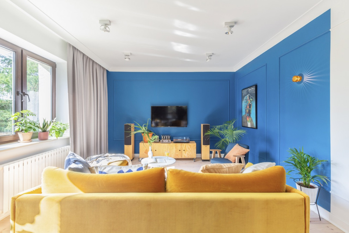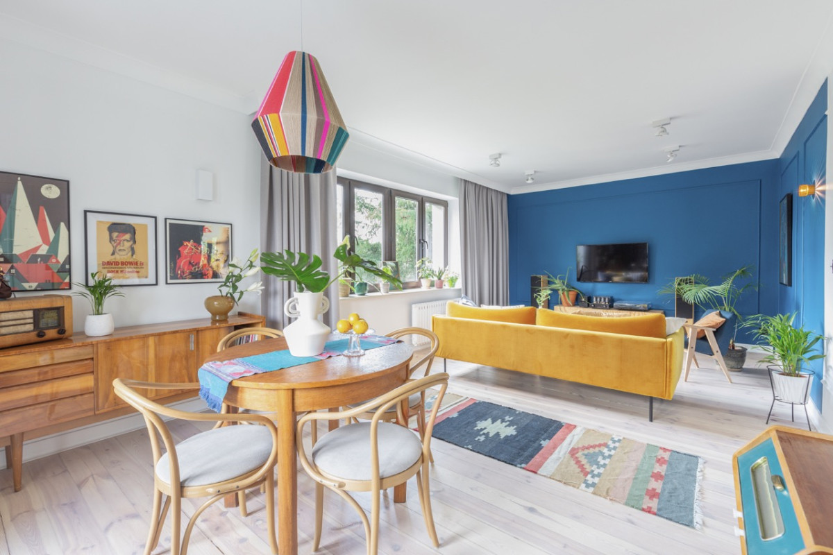 Niejako naturalnym wyborem stał się więc styl vintage, który właścicielom podobał się od zawsze. Przez wiele lat udało się̨ im zgromadzić sporo ciekawych mebli, zarówno klasyków z okresu PRL, jak i perełek designu. Oryginalny, łączący stare z nowym duch eklektyczny reprezentują w salonie pamiątki rodzinne w postaci 70-letniego stołu po prababci, foteli z lat 60. Chierowskiego model 366. po ukochanym dziadku czy komody z lat 70., tak zwanego „jamnika”. Wiele z nich właściciele samodzielnie odrestaurowali, nadając im nową jakość lub przywracając dawny blask. Dopełnieniem mieszanki różnorodności są krzesła marki Fameg przy stole, wykonane na wzór dawnych modeli Thoneta oraz plakaty muzyczne i wielokolorowa lampa nad stołem, którą wykonała własnoręcznie pani domu. Nutę nowoczesności wprowadza miodowa sofa z welurową tapicerką oraz techniczne lampy na suficie i złoty kinkiet na niebieskiej ścianie. Do koloru architekta dodała delikatne sztukaterie, które potęgują̨ efekt przyjętego w tej realizacji eklektycznego klimatu.