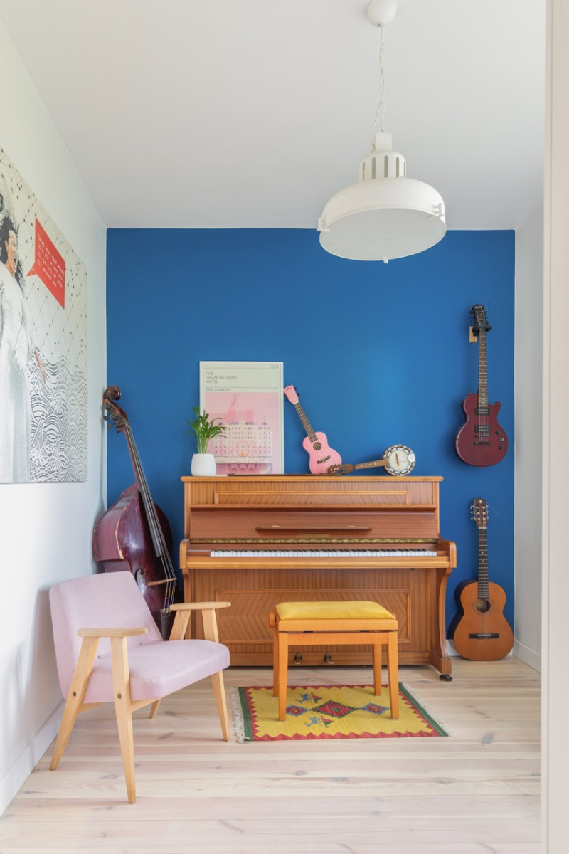 – Lubię, kiedy we wnętrzu wybrzmiewa sens, rodzina, pasje, historie i charakter właścicieli. Tak właśnie było w tym przypadku. Od początku mieliśmy rodzinne pianino, stół po prababci, fotel po dziadku oraz kolekcje zdjęć i plakatów muzycznych i filmowych. Właściciele na co dzień są związani z muzyką i tańcem, nie mogło więc tego zabraknąć w ich domu – opowiada Weronika Budzichowska.