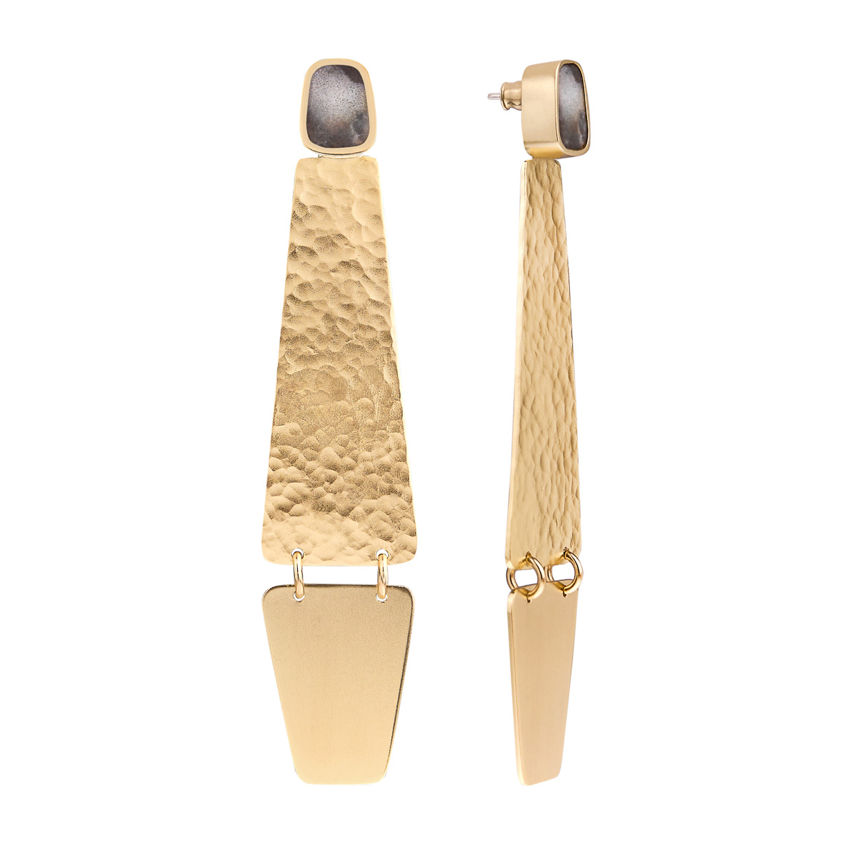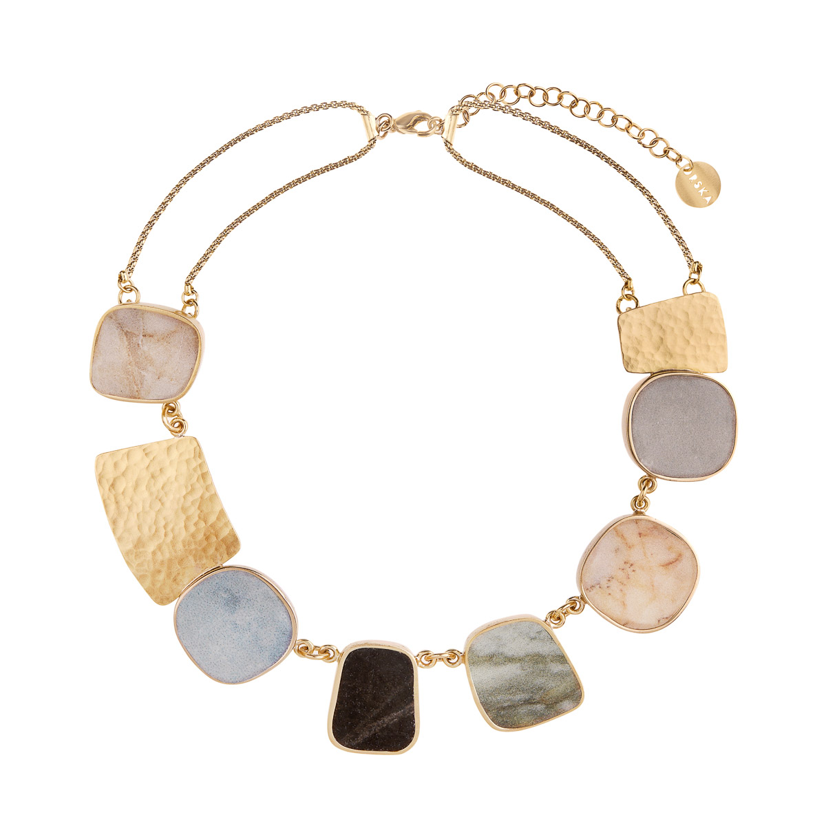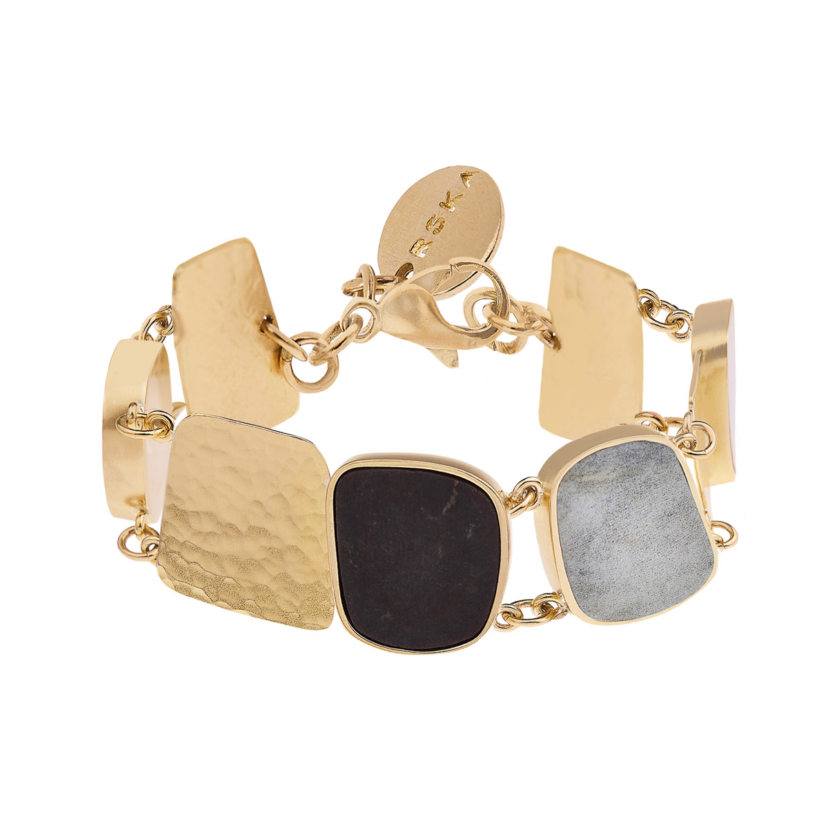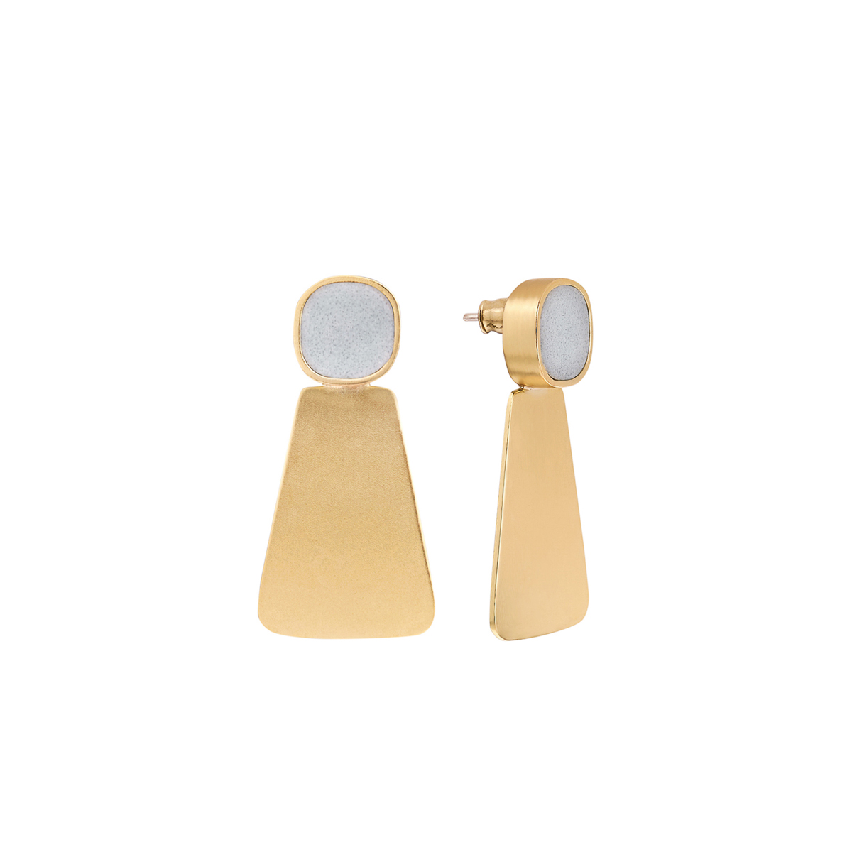 Tworząc biżuterię z kolekcji Monumental ORSKA wykorzystała fragmenty wielkowymiarowych płyt ceramicznych, które ze względu na uszkodzenia nigdy nie trafiłyby do ogólnej sprzedaży. Niczym w japońskiej sztuce renowacji kintsukuroi, brak perfekcji staje się nową wartością, z tą różnicą, że ORSKA tworzy perfekcyjne formy biżuteryjne na miarę małych dzieł sztuki. Każdy taki fragment szlifowany był niczym naturalny minerał. Krucha, acz wytrzymała, materia nie wybacza pośpiechu, dlatego obróbka jednego elementu wymagała cierpliwości i czasu. Tak przygotowane ceramiczne kamienie zostały oprawione w pozłacane ramy, a następnie połączone z geometrycznymi elementami o kutej lub satynowej powierzchni. Efekt tego połączenia przypomina jubilerską układankę, w której elementy łączą się tworząc na ciele spójną całość. Podobnie jak ceramiczne elementy scalają się ze sobą w domowych wnętrzach.