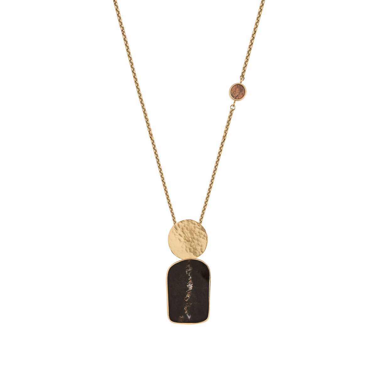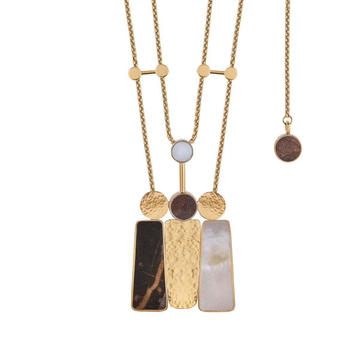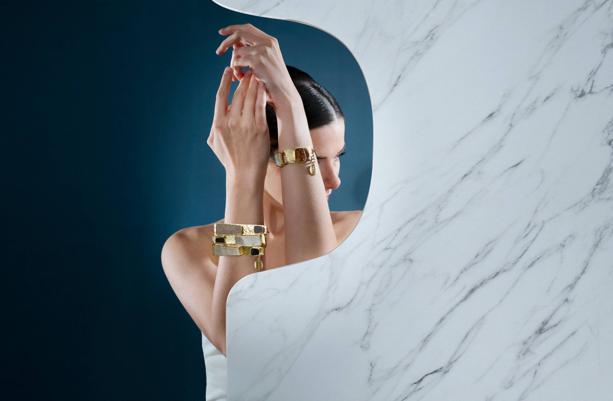 W nowej kolekcji biżuterii Anna Orska wzięła na warsztat poprodukcyjne odpady ceramiczne z linii Monumental. Elementy z kolekcji Ceramiki Paradyż przechodzą metamorfozę, stając się częścią pozłacanych dzieł sztuki jubilerskiej w duchu less waste. Ceramiczne kamienie, inspirowane strukturami naturalnych minerałów, w symboliczny sposób nawiązują do geniuszu natury i stanowią doskonały przykład współpracy pomiędzy różnymi dziedzinami sztuki rzemieślniczej.