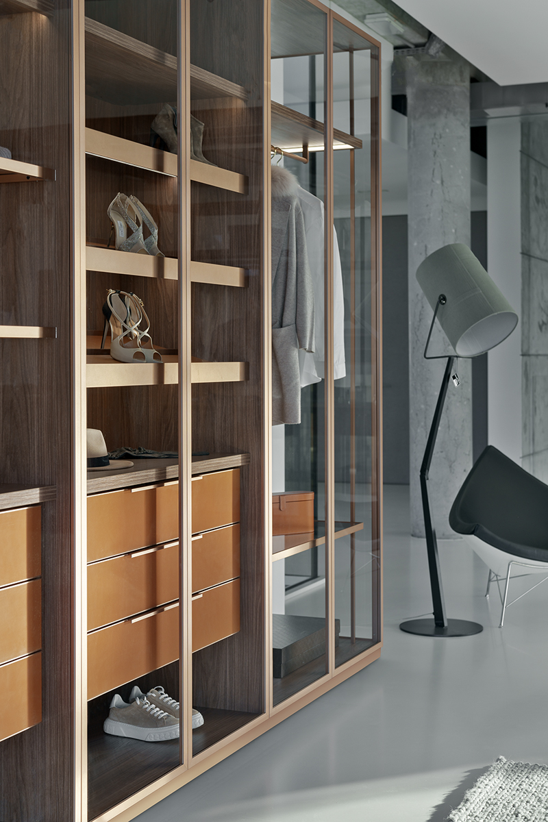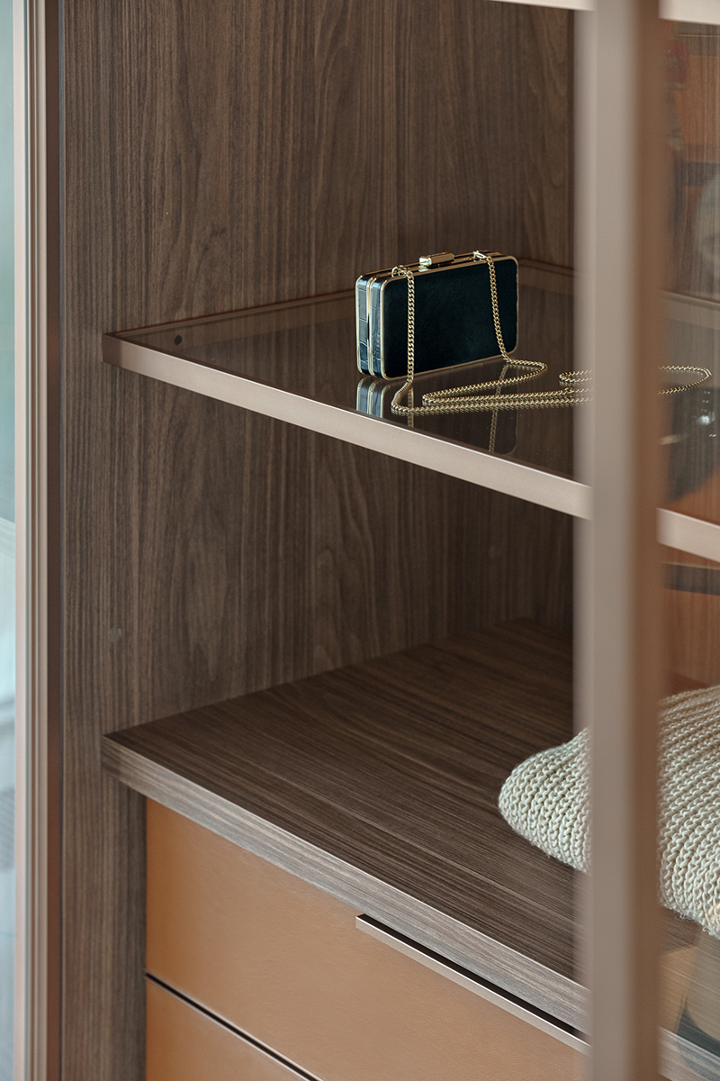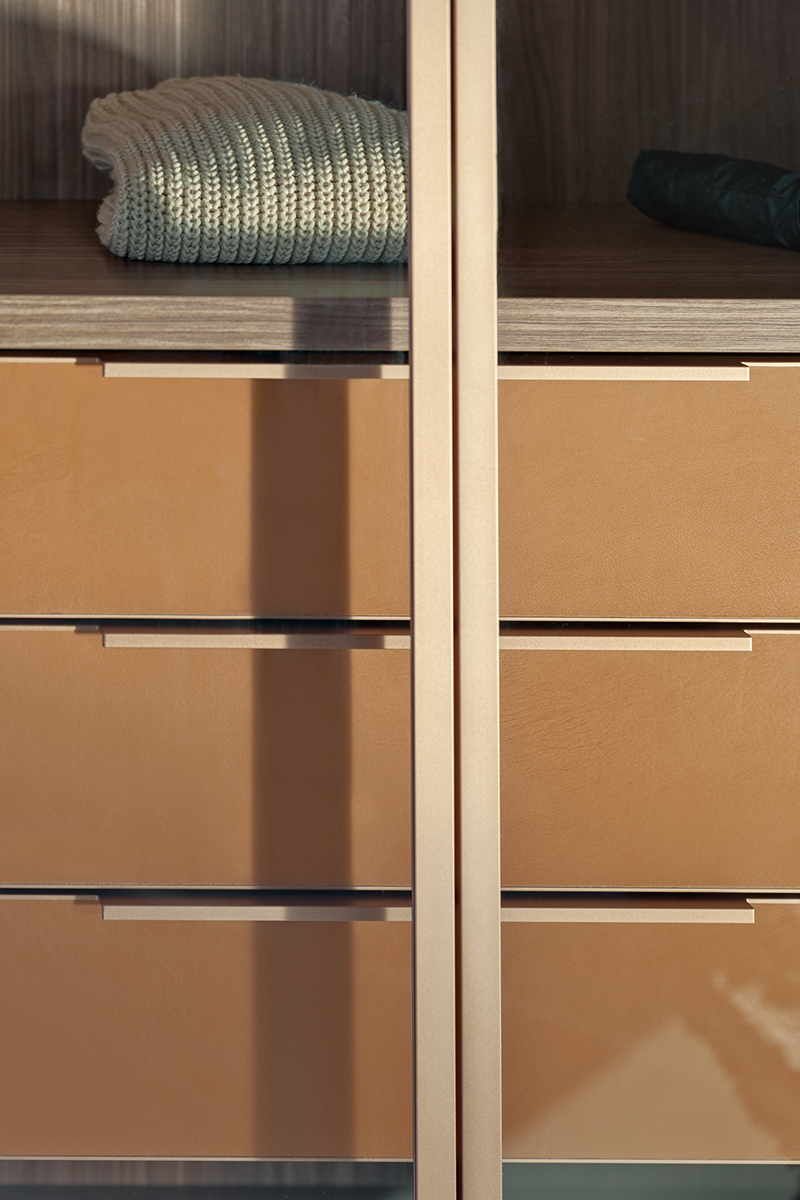 Luksusowy efekt całości zapewniają materiały oraz oświetlenie LED najnowszej generacji z ukrytymi, niewidocznymi źródłami, a zapewniającymi równomierną iluminację wnętrza. Ścianki garderoby pokryte są wysokiej jakości laminatem strukturalnym, który odwzorowuje najbardziej popularne gatunki drewna nie tylko pod kątem koloru i rysunku, ale również teksturalnym. W dotyku też nie różnią się od naturalnego materiału. Rama wykonana jest z aluminium – lekkiego, trwałego i odpornego metalu – i dostępna w szerokiej gamie kolorystycznej. Na przykład zgaszonej miedzi, która nadaje całości szlachetnego, matowego bliku. Elementy ozdobne, np. uchwyty szuflad wykonane są z miedzi.