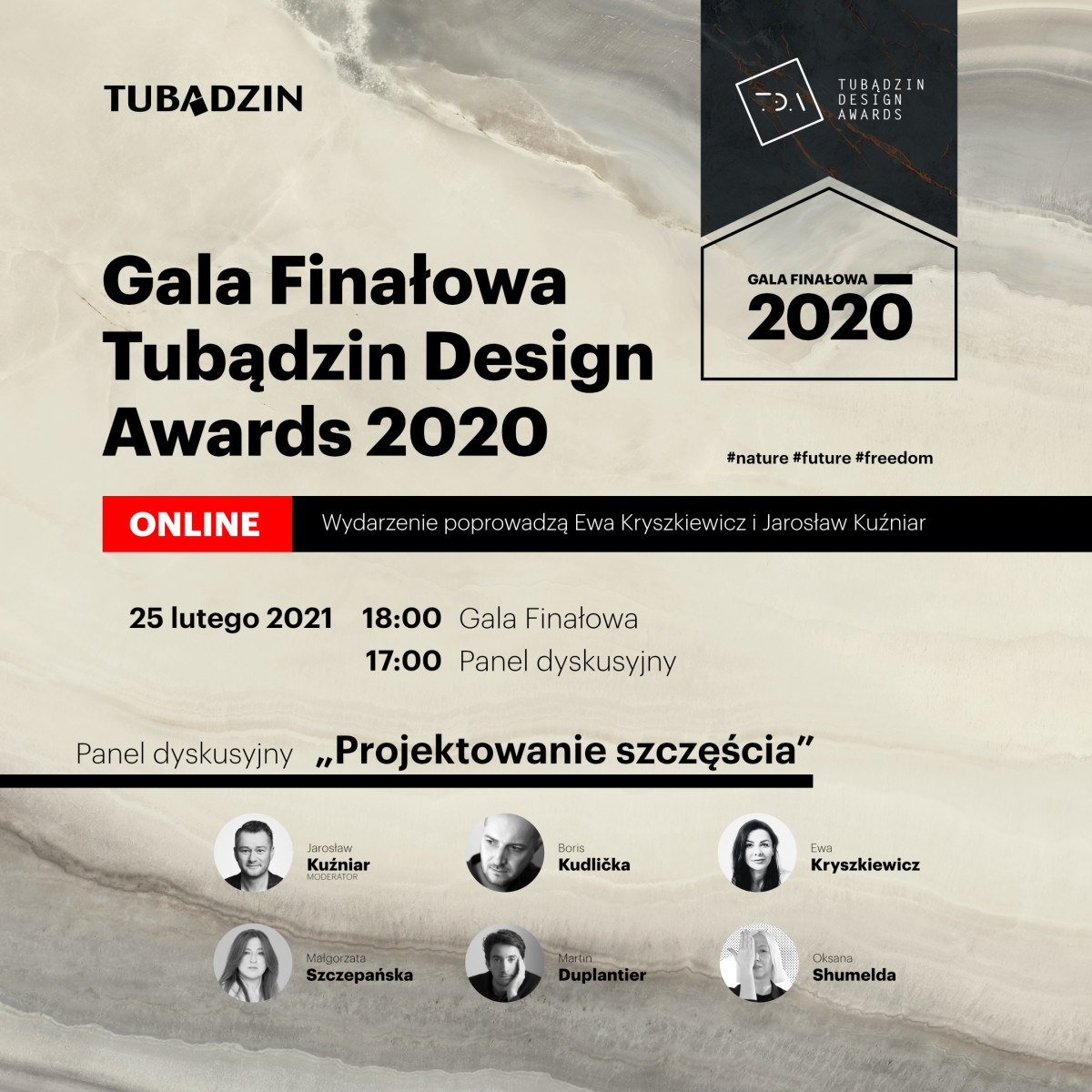 Gala finałowa Tubądzin Design Awards 2020 odbędzie się 25 lutego, o godzinie 18.00, w gmachu Akademii Sztuk Pięknych w Łodzi. Ze względu na obostrzenia sanitarne i bezpieczeństwo gości, zorganizowana jest ona bez udziału szerokiej publiczności, jednak transmisja na żywo, w trzech wersjach językowych, dostępna będzie na stronie: www.tubadzin.pl/TDAFINALGALA