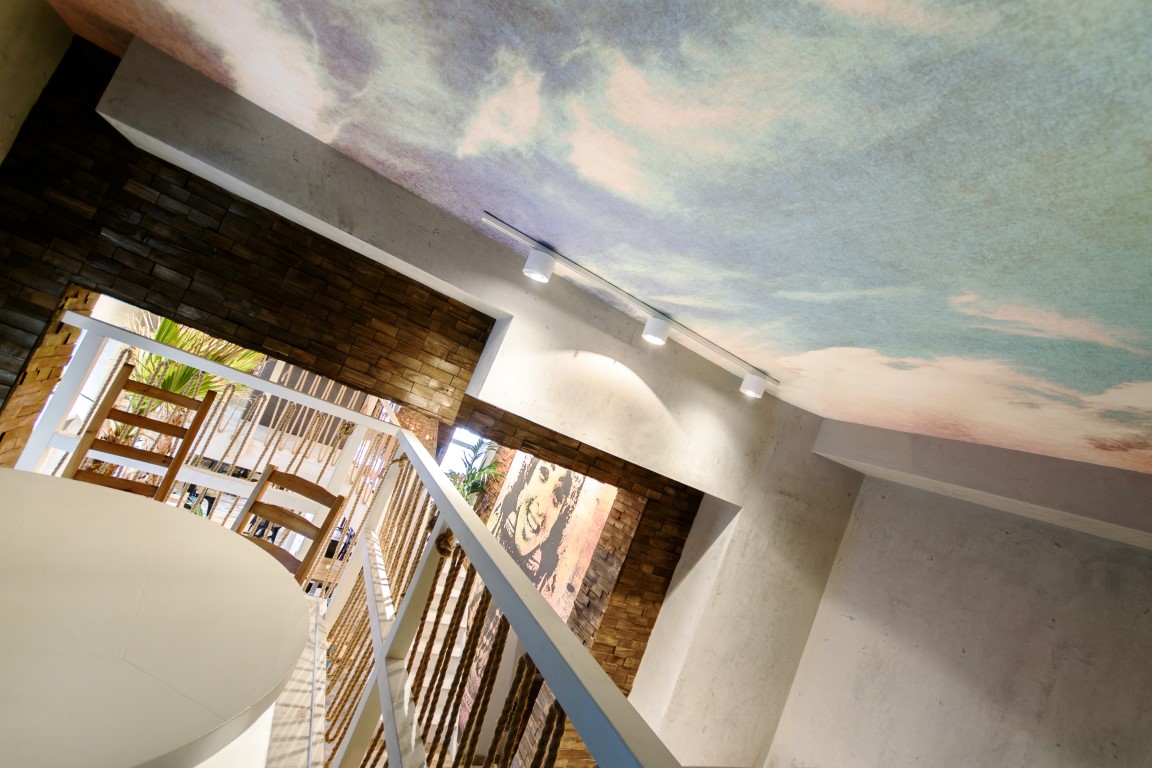 Innym przykładem była Mango Mama, której właścicieli oczekiwali w wystroju ścian nawiązania do nazwy oraz stylu lokalu. „W Mango Mama zaproponowaliśmy wizerunek „Mamy”, która sprawuje pieczę nad lokalem. Spoglądając w górę możemy dostrzec motyw nieba, który optycznie wydłuża i powiększa wnętrze.” – mówi Paweł.