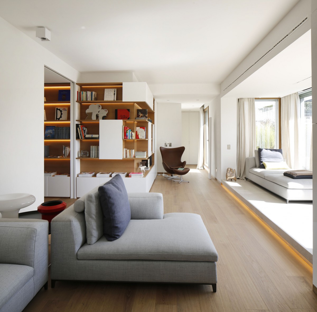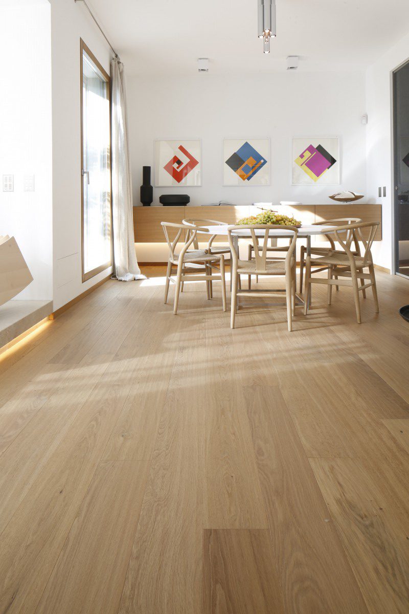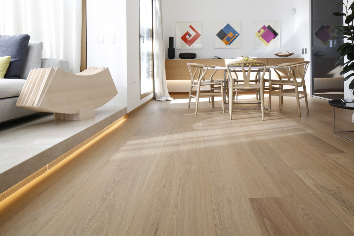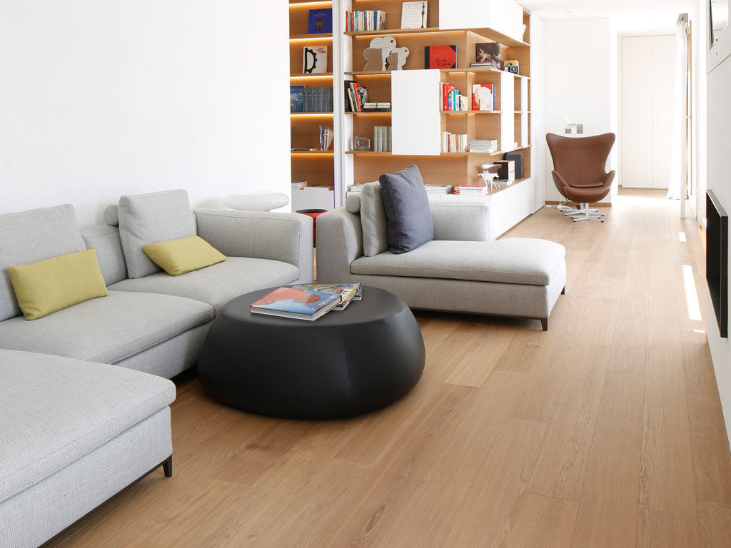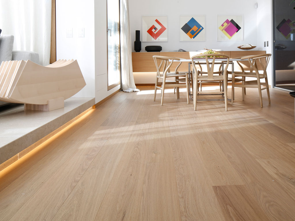 Powierzchnie ścian pokryte naturalnym wapnem są nieprzeźroczyste, miękkie i aksamitne w dotyku. Ta nieskazitelna ścienna biel idealnie komponuje się ze stylową podłogą drewnianą Heritage traccia Civita z kolekcji Atelier od Listone Giordano. Dzięki wykończeniu Invisible Touch Fibramix lakierowany dąb francuski w jasnej tonacji przypomina w wyglądzie i w dotyku podłogę olejowaną. Na specjalne życzenie projektanta zachwyconego techniką strugania desek starymi metodami, powstały również listwy na bazie desek parkietowych. To szlachetne drewno, pokrywające równomiernie całą poziomą powierzchnię, nadaje przestrzeni mieszkalnej nowoczesnego, a zarazem ciepłego klimatu.
