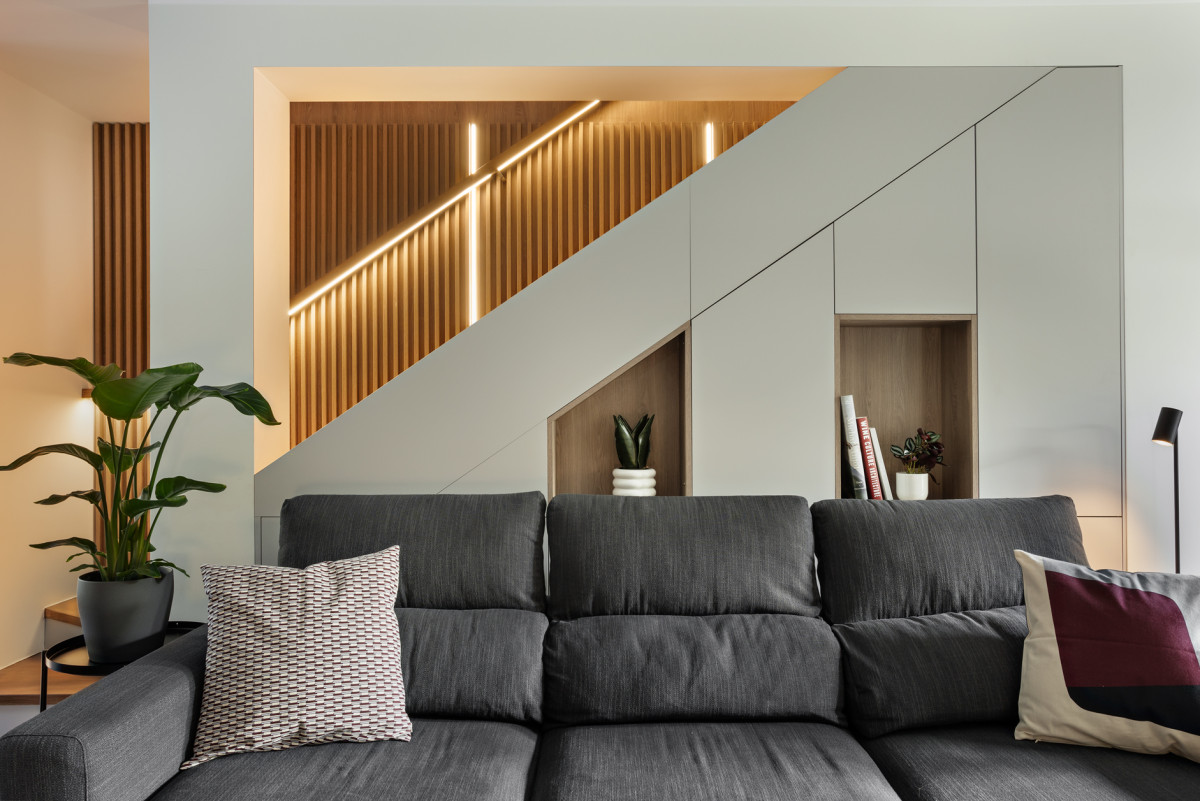 Pod schodami pojawił się wygodny, obszerny narożnik, który stanowi serce strefy wypoczynkowej. Zabudowa przestrzeni pod schodami stworzyła dodatkowe miejsce na przechowywanie i wyraźnie wydzieliła strefę wypoczynkową. Towarzyszy mu stylowy stolik kawowy, tworząc idealne miejsce na rodzinne wieczory lub spotkania z przyjaciółmi. Całość dopełnia ściana telewizyjna, która zyskała nowoczesny charakter dzięki meblom na wymiar. Funkcjonalne szafki i półki pozwalają na praktyczne przechowywanie, jednocześnie nadając wnętrzu elegancji.