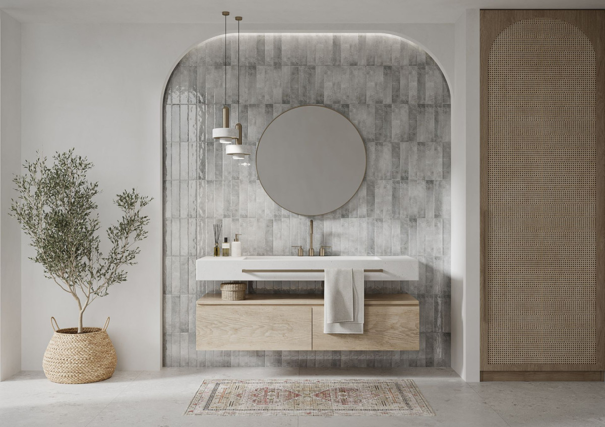 Styl kojącego stonowanego japandii czy przesiąknięty barwami słońca styl śródziemnomorski już w pełni zagościły w polskich wnętrzach. Płytka MONPELLI wpisuje się w każde z tych rozwiązań. Komfort, funkcjonalność i ascetyzm formy, połączone przy użyciu strukturalnej płytki w bieli czy delikatnej szarości Ash, uzupełnione o barwy Ivory, gwarantują pełen relaks i spokój we wnętrzu. Charakterystyczne wykończenie cegiełek, nawiązujące do rzemieślniczej pracy ludzkich rąk, to ukłon w stronę kultu piękna niedoskonałości i odejście od idealnie prostej formy na korzyść miękkiej sensualnej krawędzi ukrytej w formie płytki. Wspomniane japandii nacechowane subtelnością zen, nastawieniem na spokój i wyciszenie, które możemy osiągnąć przebywając w tym wnętrzu. W kontraście do kojącej japońskiej harmonii możemy zestawić wybuchowy wręcz, kolorowy styl Memphis. Coraz częściej pojawiający się we wnętrzach publicznych (kawiarnie, hotele) i powoli wchodzący również na salony. Pełen geometrycznych wzorów, mocnych i pastelowych kolorów użytych w kontrastowych zestawieniach, bawi się formą i nieoczywistym formatem. Klasyczna cegiełka o organicznej fakturze jest przełamana kompozycją ze strukturalnymi, apetycznymi „biszkopcikami” w wersji wypukłej czy wklęsłej.