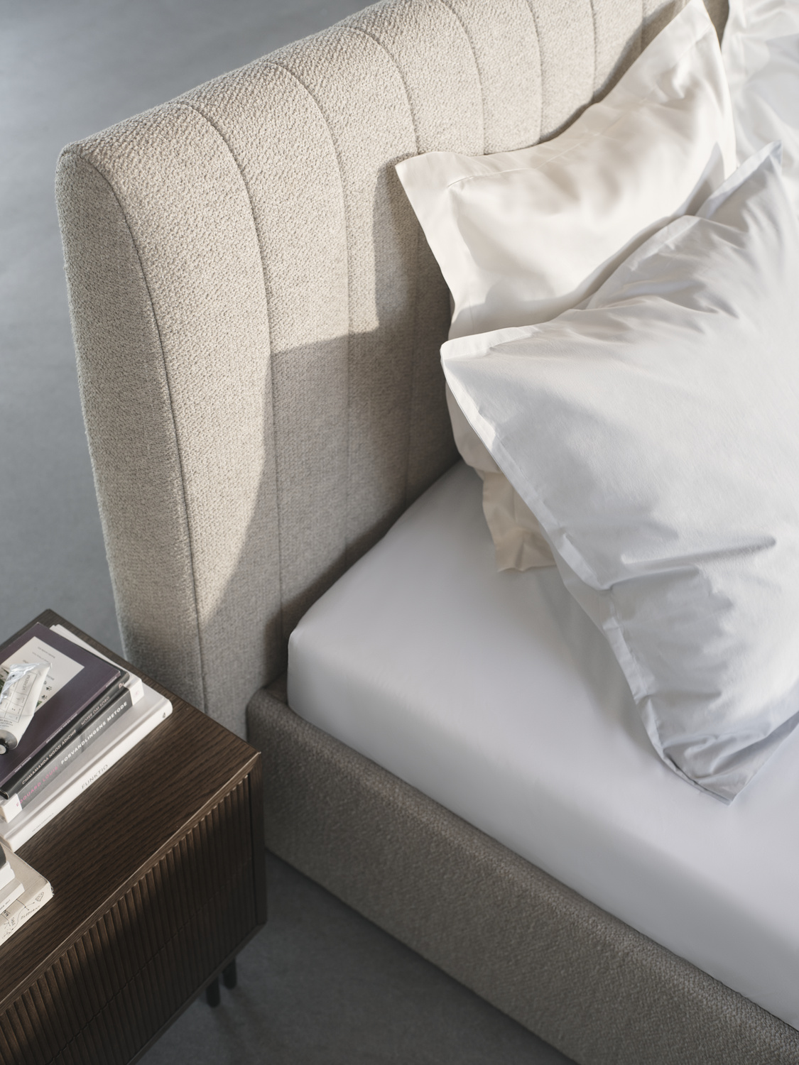 Wykonane z drobiazgową dbałością o proporcje i wygodę, Bolzano to coś więcej niż mebel – to doświadczenie. To wyrazista propozycja dla tych, którzy pragną jednocześnie elegancji i miękkości. Od zaokrąglonego wezgłowia, po gładkie matowe wykończenia i owinięte tkaniną ramy, każdy szczegół sprawia wrażenie poczucia bezpieczeństwa i zmysłowości. To podejście głęboko współgra z naciskiem WGSN na dobre samopoczucie. W prognozie na 2025 r. analitycy podkreślają, że przesiąknięte kolorami, teksturowane materiały i wciągające oświetlenie mają kluczowe znaczenie dla tworzenia sypialni, które przypominają kokon i są emocjonalnie regenerujące.