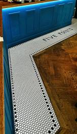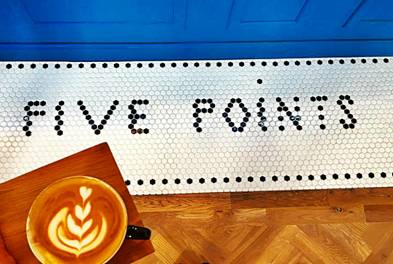 Jedną z realizacji, która w zaskakujący sposób eksponuje DUNIN Mini Hexagon Spot jest kawiarnia Five Points w Bratysławie. Poprzez niestandardowe użycie czarno-białych płytek twórcy zaakcentowali nazwę miejsca, a także nadali mu stylowy charakter.