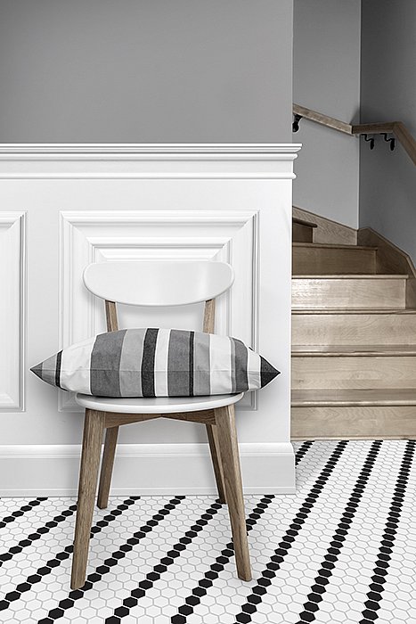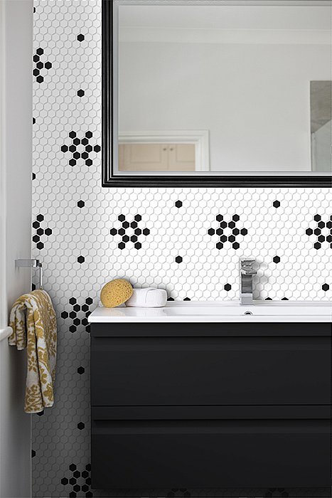 Modny sześciokątny kształt monochromatycznych płytek dzięki kontrastowym zestawieniom pozwala na wykreowanie oryginalnych rozwiązań.