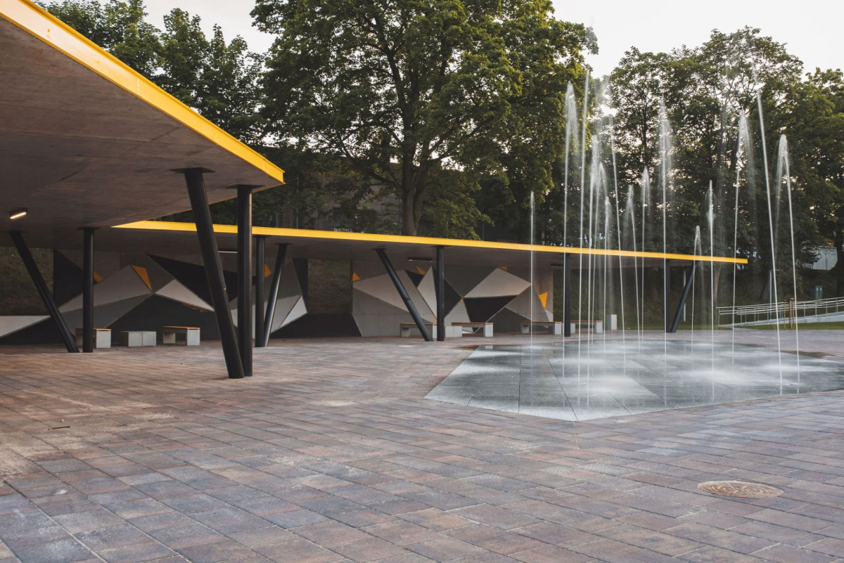 Duży amfiteatr otrzymał minimalistyczną formę, która jest spójna z projektem całej przestrzeni. Obiekt umieszczono tak, aby występy można było oglądać praktycznie z każdego miejsca. Przed amfiteatrem umieszczono także rzędy ławek. Niezwykle efektownym elementem placu jest podświetlana fontanna. Strumienie wody wytryskują wprost z podłoża, co pozwala dzieciom na bezpieczną zabawę w letnie dni. Fontanna dostarcza nie tylko wrażeń estetycznych, ale również chłodu w czasie upałów. Otaczają ją zadaszone wiaty z ławkami. Trafnie przemyślano także potrzeby młodzieży, wygospodarowując przestrzeń na niewielki skatepark. Całość kompozycji oparto o charakterystyczną dla pracowni BIASTUDIO grę kątami, ukosami i różnorodnością faktur.