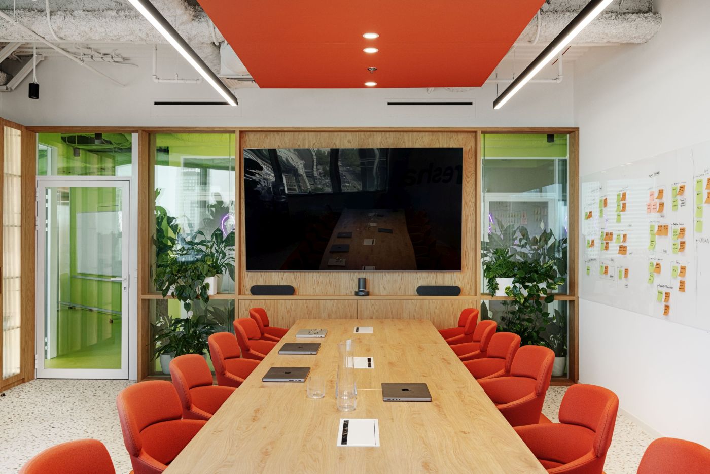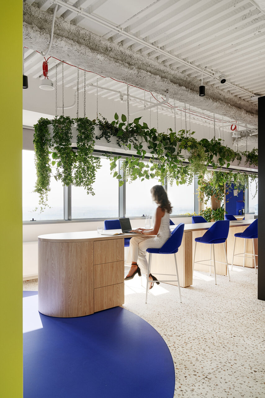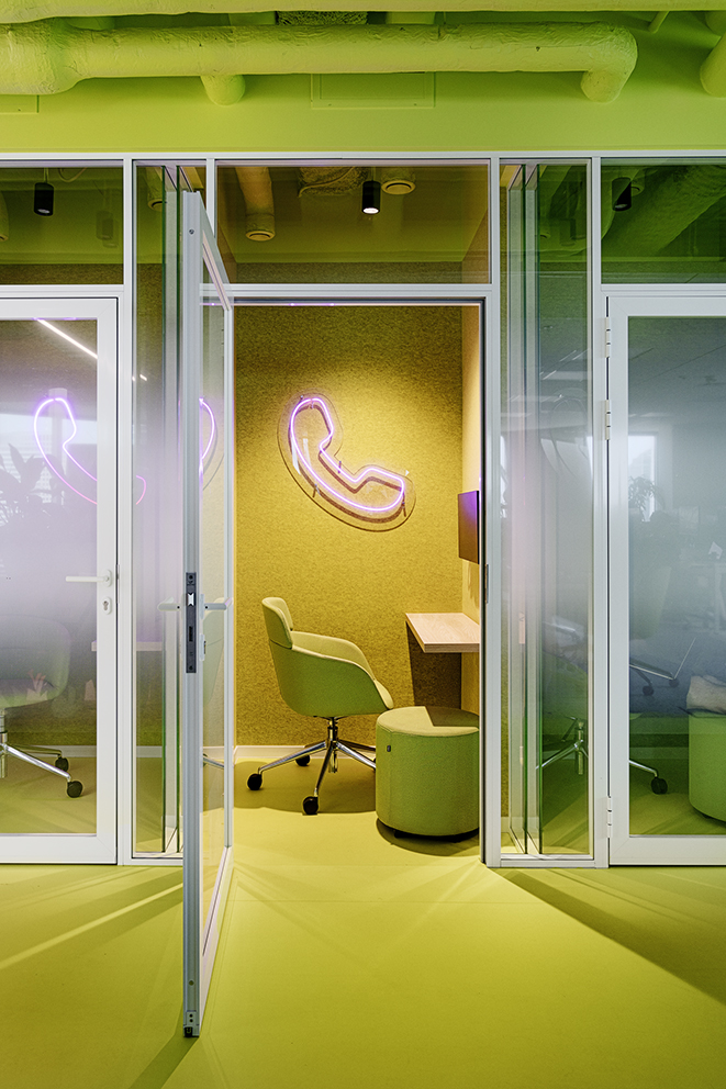 Układ biura oparto na otwartej strukturze uzupełnionej o szklane przegrody, które wydzielają poszczególne sekcje, nie odbierając przy tym poczucia przestronności. Podczas projektowania architekci zadbali również o rozwiązania sprzyjające pracy indywidualnej: strefy cichej pracy utrzymane zostały w neutralnych, stonowanych kolorach, a komfort akustyczny zapewniają dźwiękochłonne budki telefoniczne, akustyczne sufity oraz filcowe wykładziny. Przestrzeń wzbogacono także o naturalną zieleń, w tym wiszące rośliny, które tworzą przyjazne środowisko dla pracowników. Całe wnętrze emanuje świeżością i dobrą energią, wiernie odzwierciedlając tożsamość firmy.