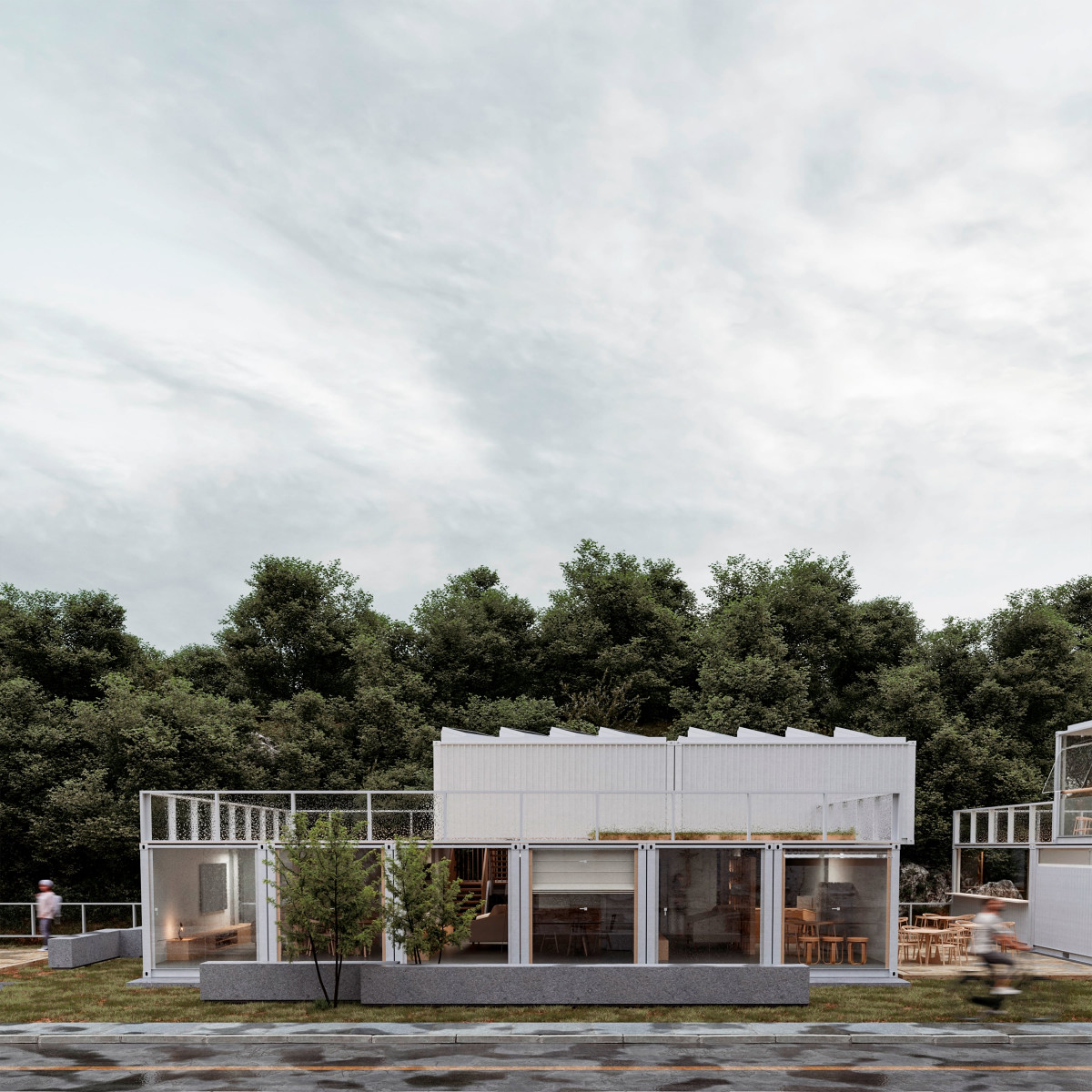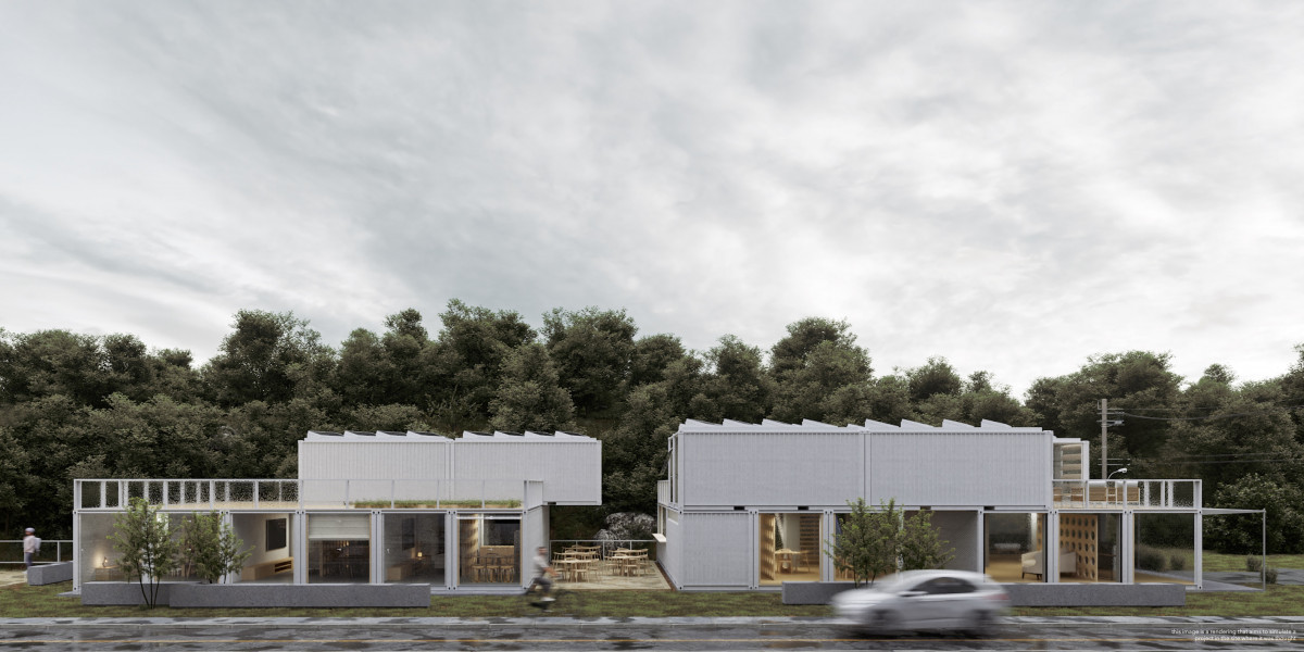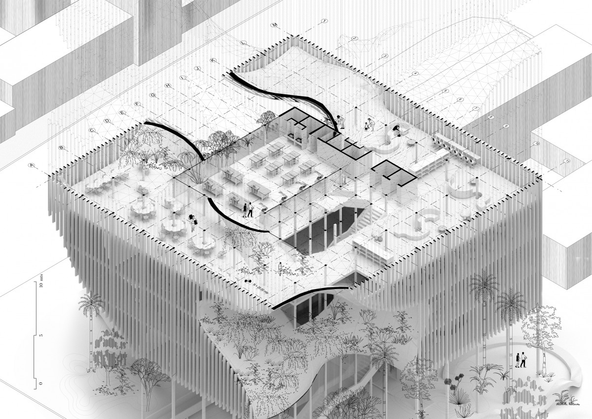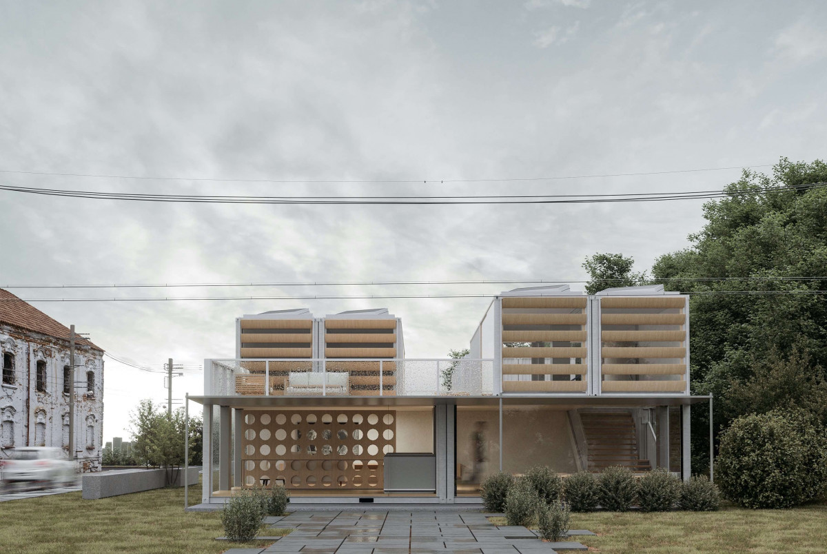 Na dachu zaproponowano nadbudowę w formie nowoczesnego pawilonu z drewna CLT będącego przestrzenią o funkcji coworkingu dla mieszkańców, która nawiązuje do konstrukcji żelbetowych widocznych na zdjęciach historycznych.