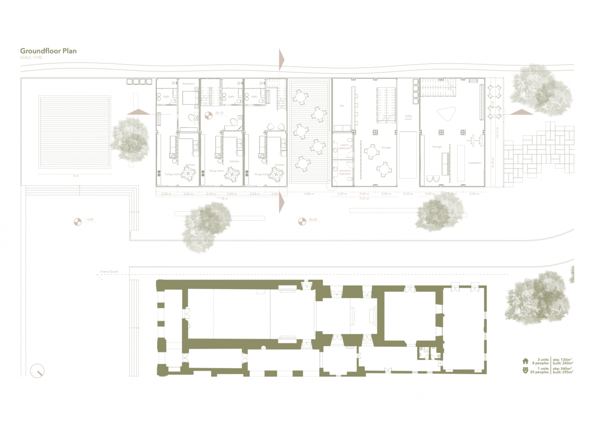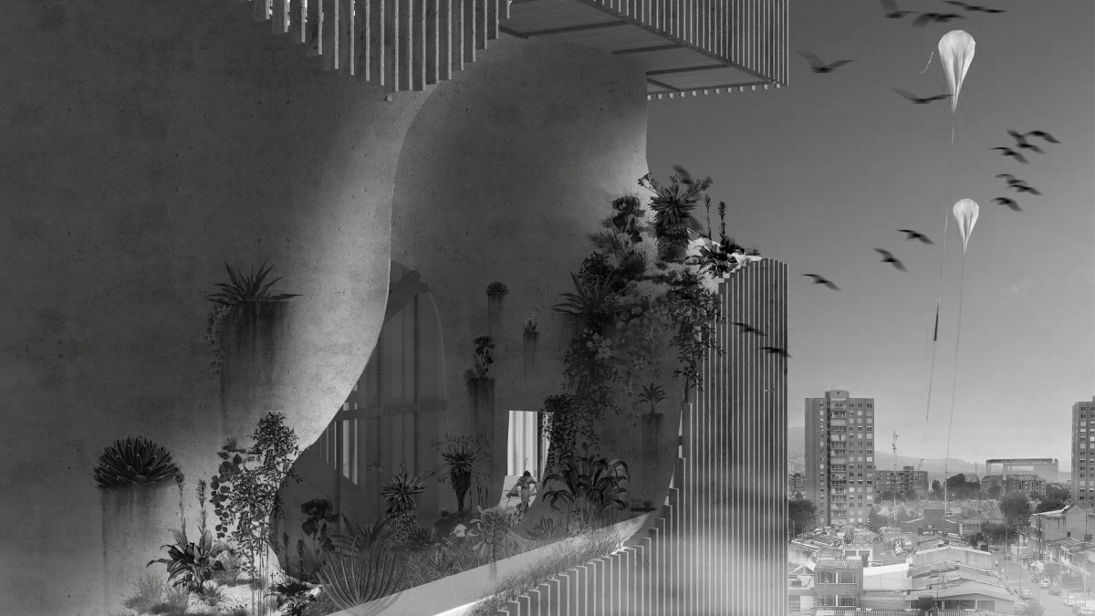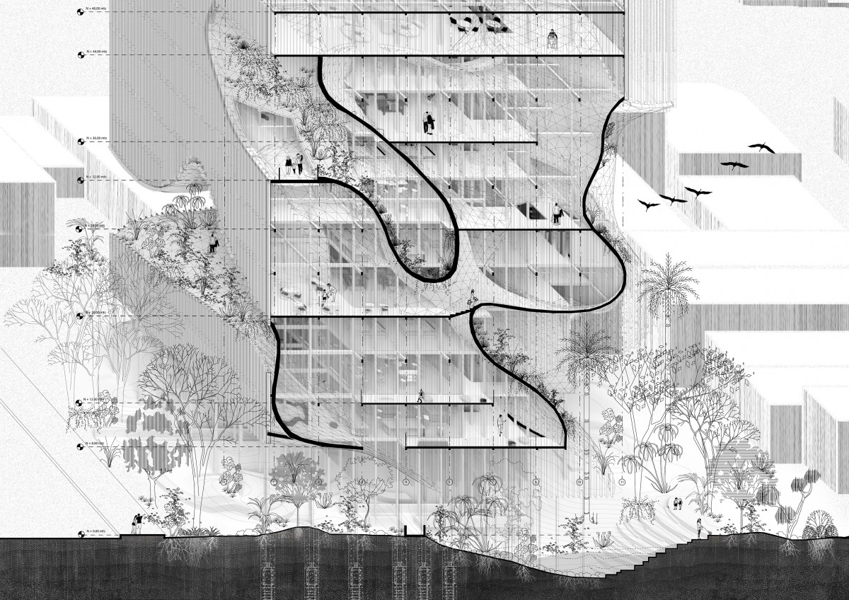 Na dachu zaproponowano nadbudowę w formie nowoczesnego pawilonu z drewna CLT będącego przestrzenią o funkcji coworkingu dla mieszkańców, która nawiązuje do konstrukcji żelbetowych widocznych na zdjęciach historycznych.
