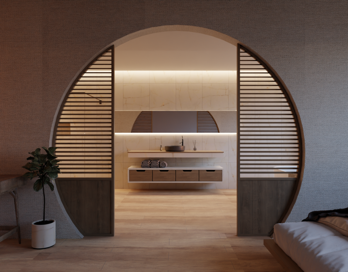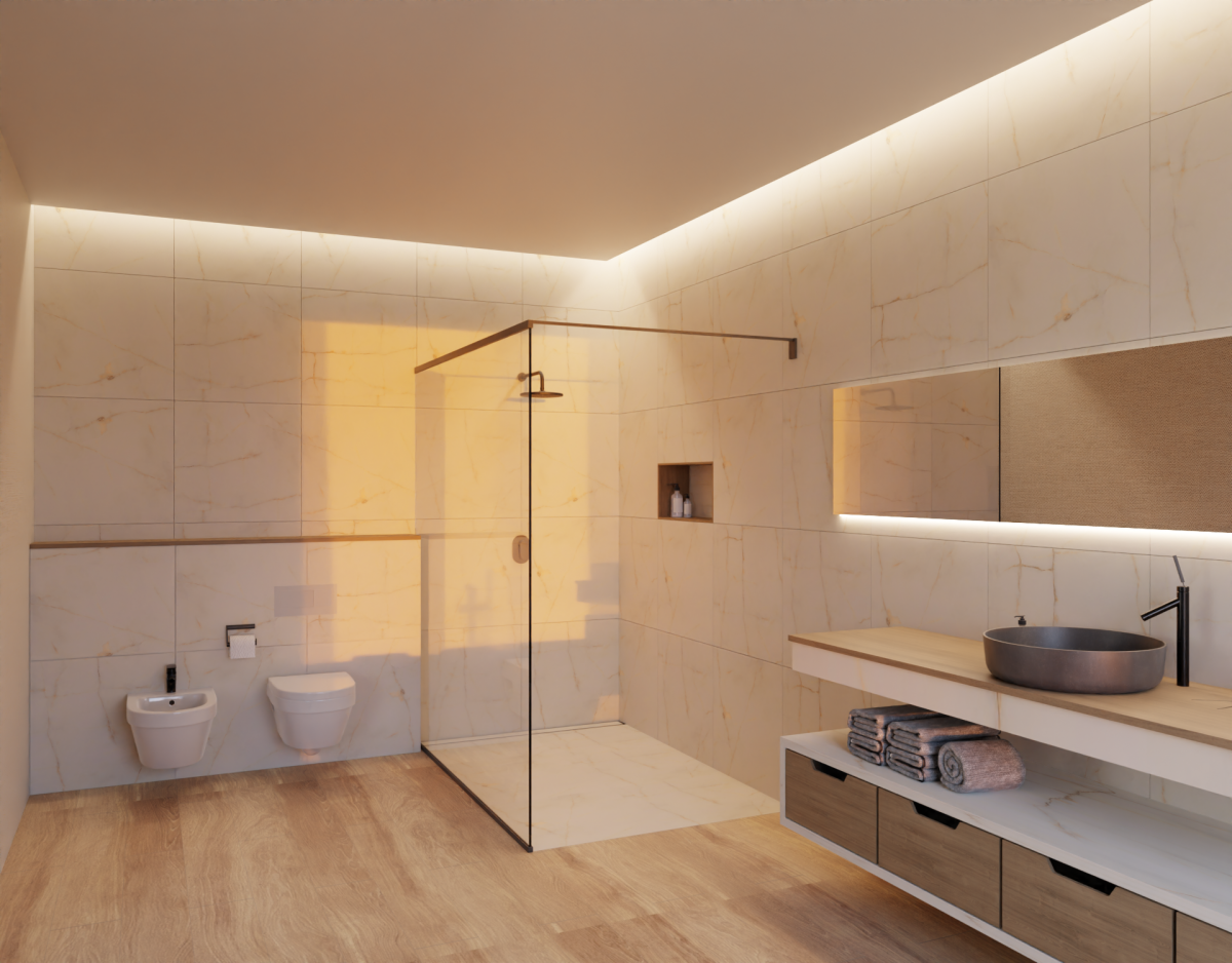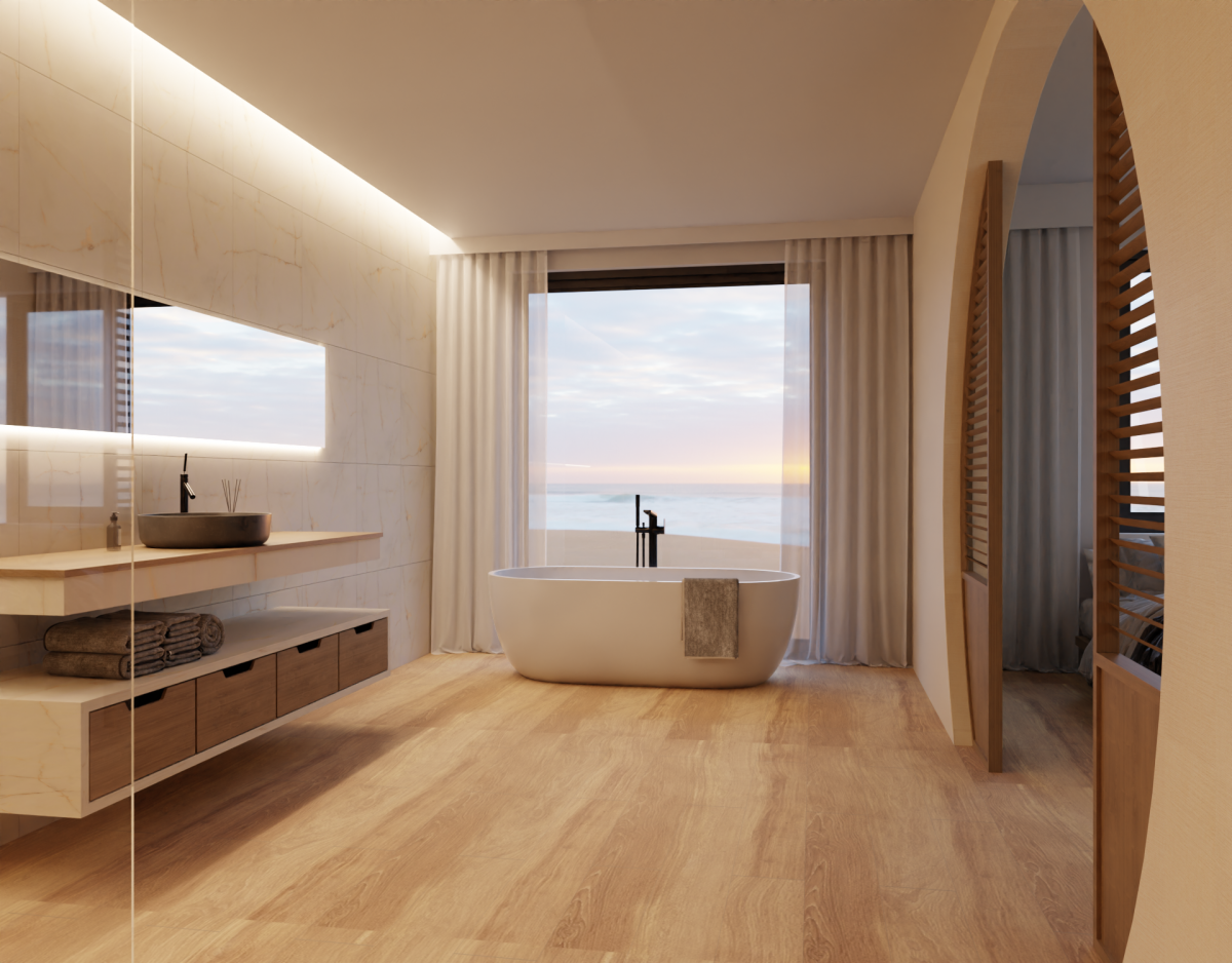 Pragnę przedstawić dla Państwa swój projekt Łazienki, do jej aranżacji wykorzystałem płytki z grupy Tubądzin. Podłoga została pokryta płytkami Alami Beige str 1198×190. Na ścianach znajdują się płytki gresowe Ambra Bianca 1198×1198 oraz materiał Chenille grey. Płytki Tubądzin sa bardzo eleganckie i pozwoliły mi na zaprojektowanie wnętrza ekskluzywnego inspirowanego plażą. Pomimo użycia do wykończenia tego pomieszczenia materiałami twardymi jest ono ciepłe i lekkie. Łazienka ta to miejsce funkcjonalne oraz przestrzeń stworzona do relaksu i delektowania się pięknymi widokami które umożliwia duże przeszklenie. w kluczowym miejscu projektowanego wnętrza.