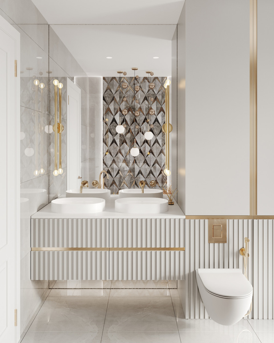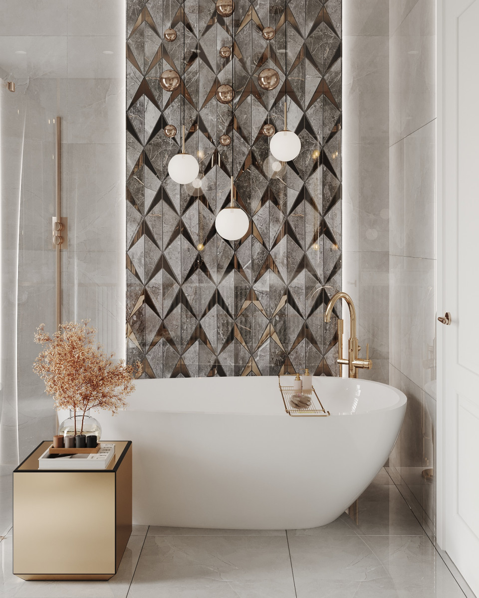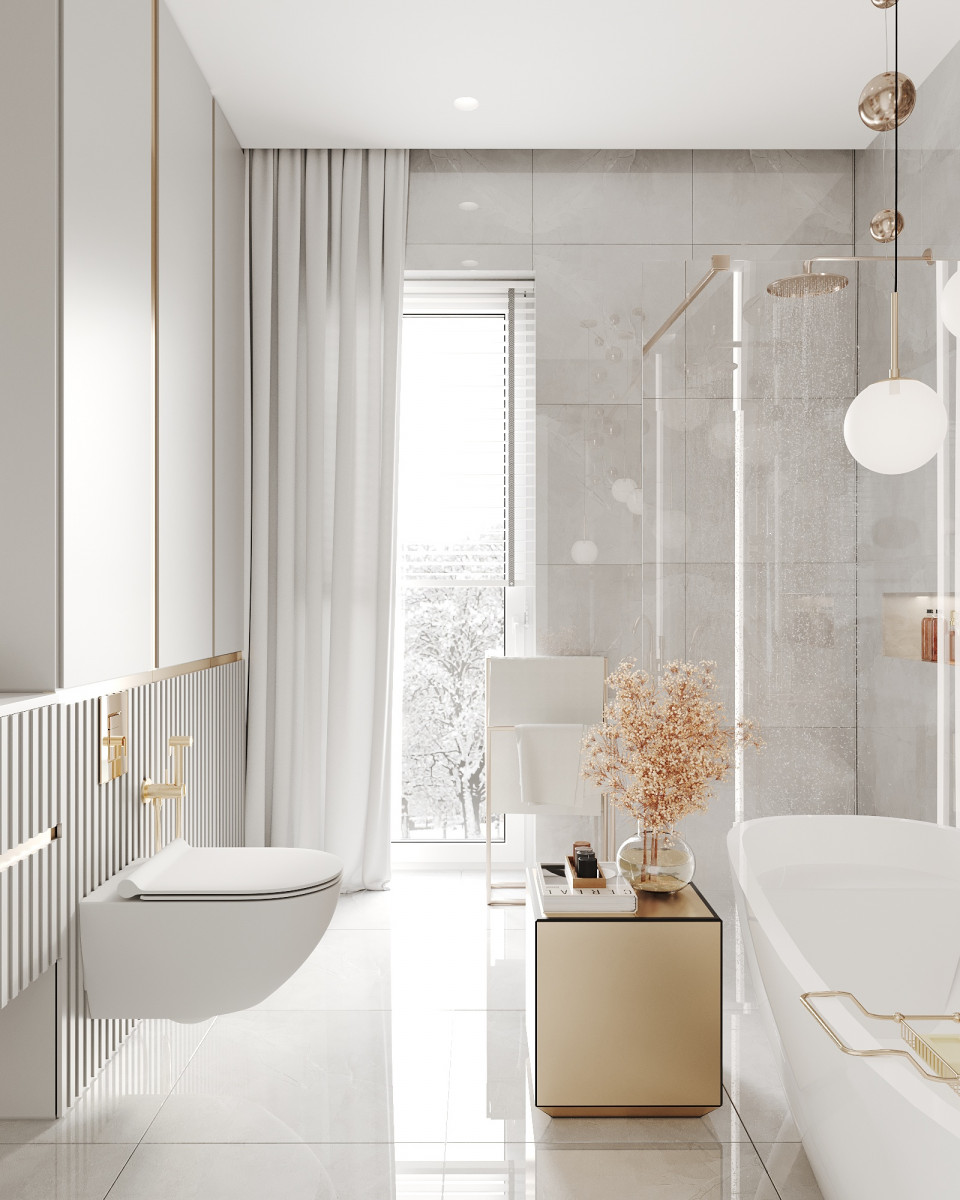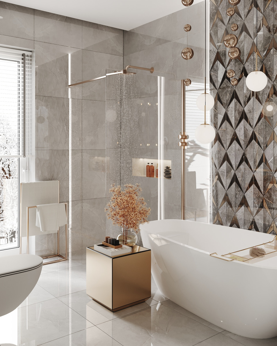 Łączy w sobie klasykę oraz nowoczesność. Wszystko za sprawą jasnych kolorów oraz złotych dodatków, które zawsze będą modne i ponadczasowe. Warto zwrócić uwagę na funkcjonalność łazienki. Jest przestronna. Posiada dużo miejsca na przechowywanie. Jej głównym punktem dekoracyjnym jest ścianka za wanna. Zdobi ją mozaika BRAINSTORM GRAPHITE. Całość uzupełnia przepiękna płytka gresowa imitująca naturalny kamień BRAINSTORM GREY.