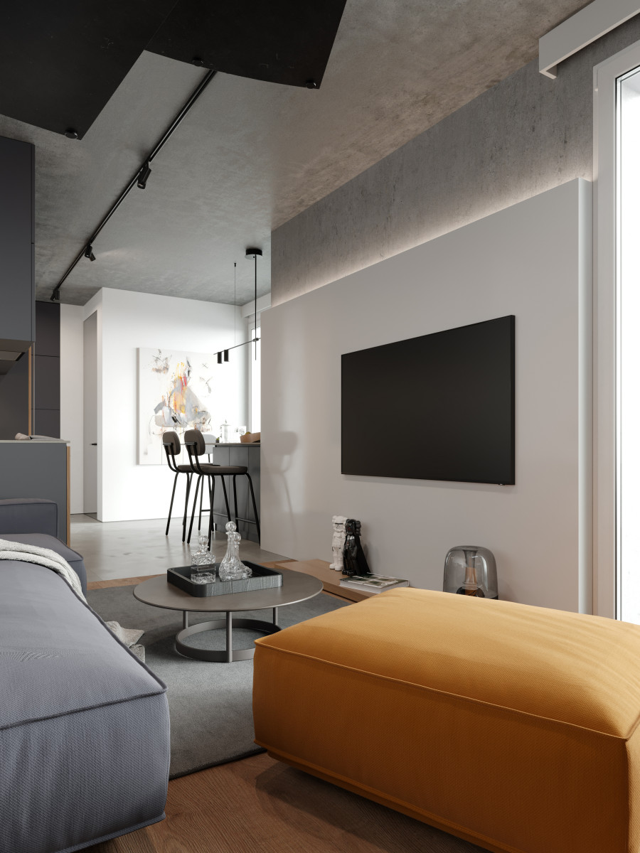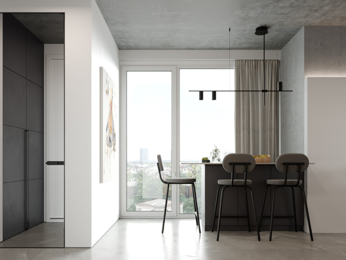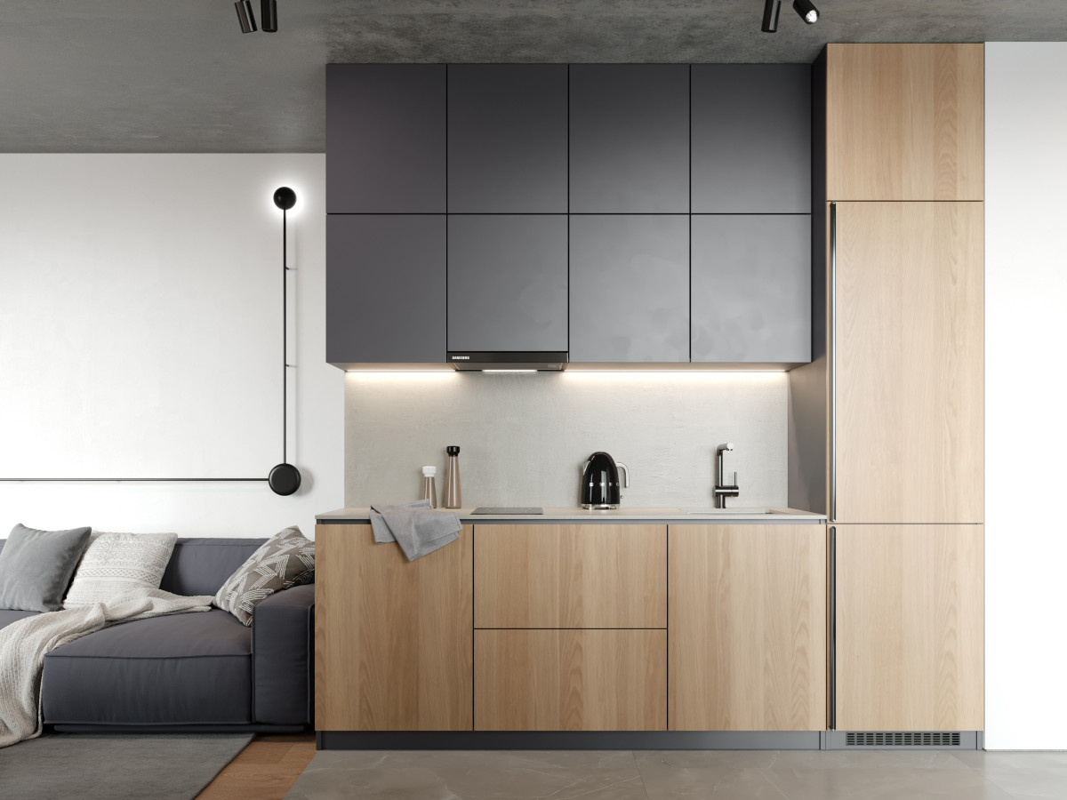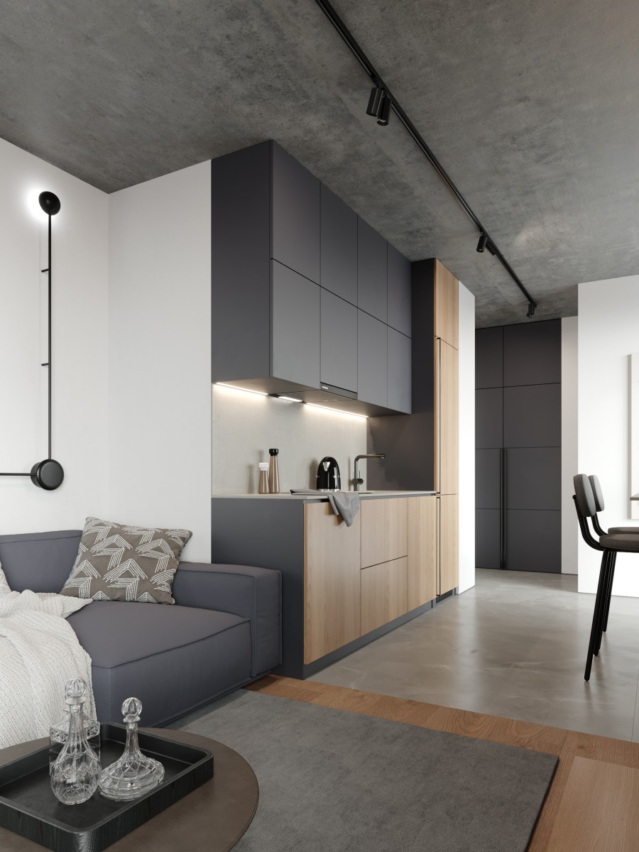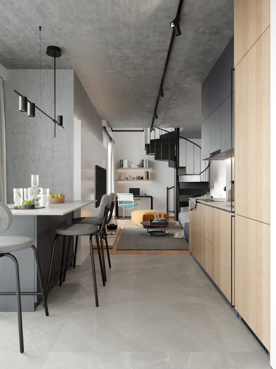 Projekt dwupoziomowego mieszkania w Warszawie dla młodego, energicznego mężczyzny. Podstawą był minimalizm, naturalne odcienie i materiały