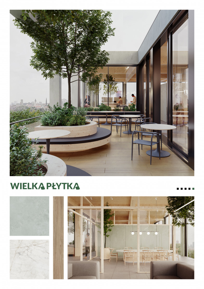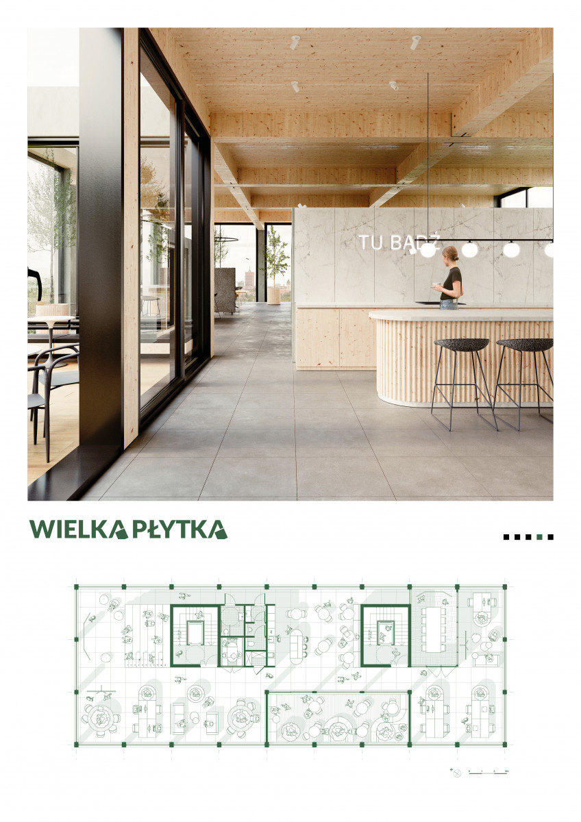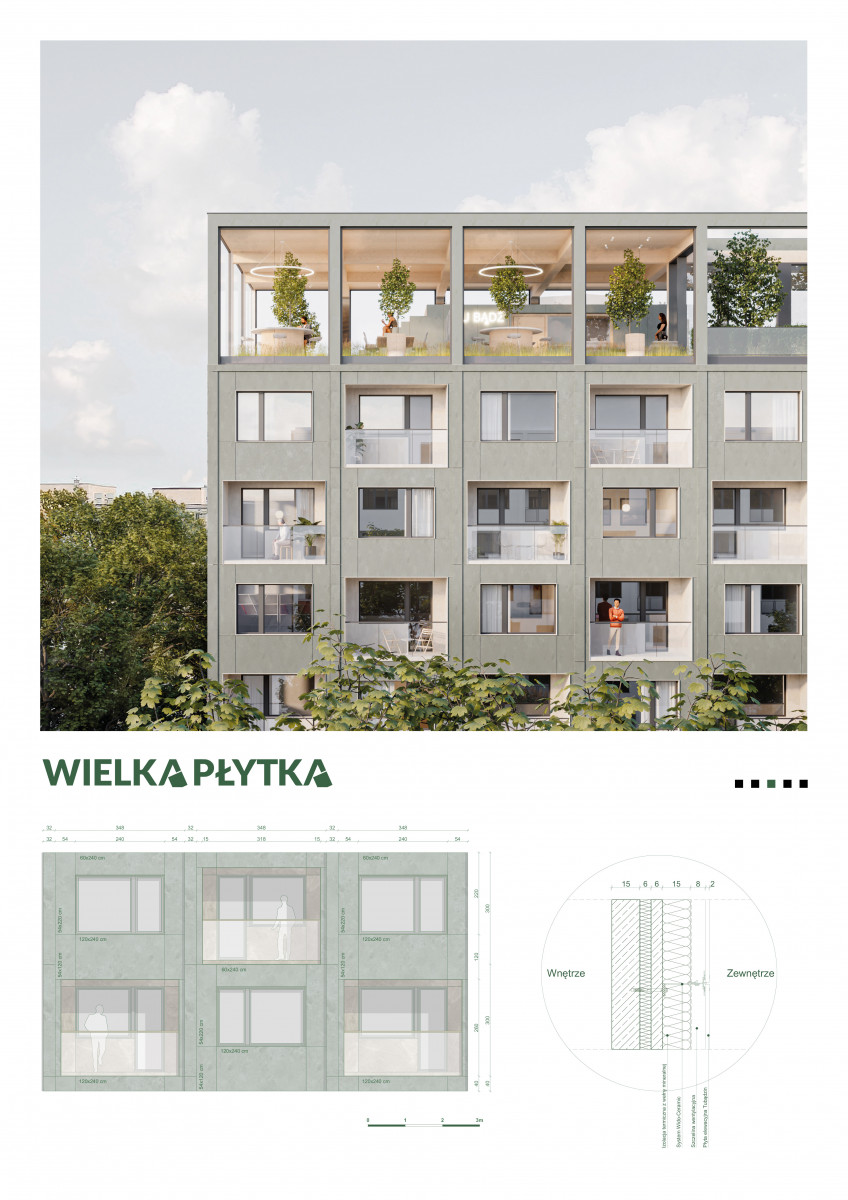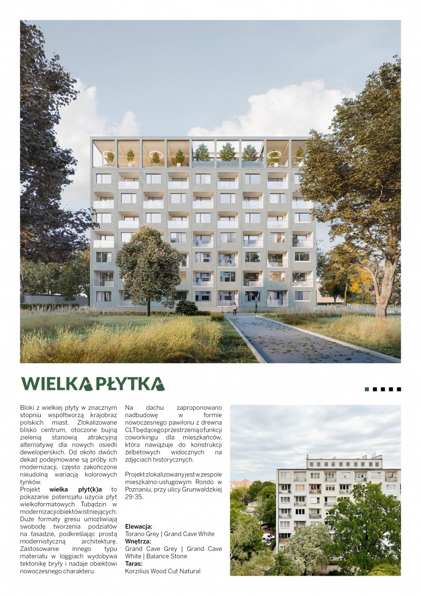 Projekt wielka płyt(k)a to pokazanie potencjału użycia płyt wielkoformatowych Tubądzin w modernizacji obiektów istniejących. Duże formaty gresu umożliwiają swobodę tworzenia podziałów na fasadzie, podkreślając prostą modernistyczną architekturę. Zastosowanie innego typu materiału w loggiach wydobywa tektonikę bryły i nadaje obiektowi nowoczesnego charakteru.
