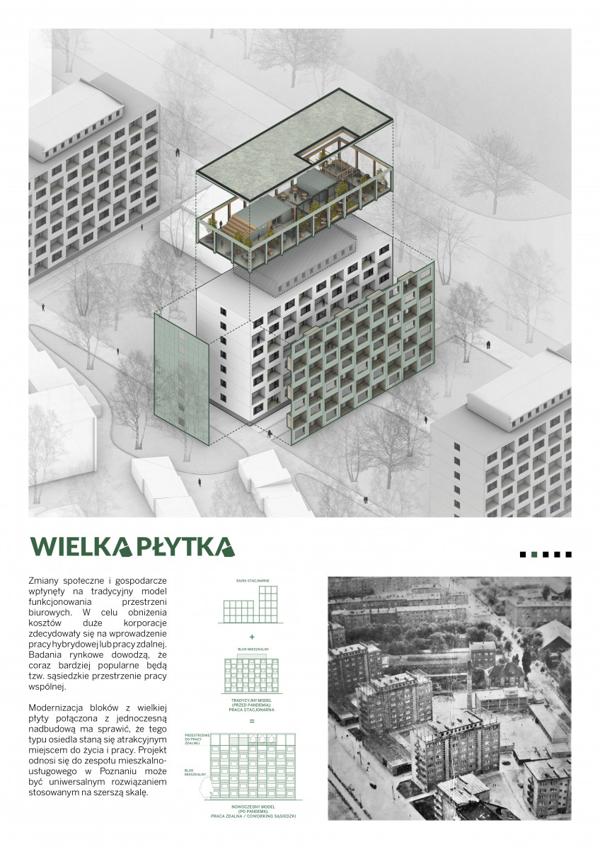 Modernizacja bloków z wielkiej płyty połączona z jednoczesną nadbudową ma sprawić, że tego typu osiedla staną się atrakcyjnym miejscem do życia i pracy. Projekt odnosi się do zespołu mieszkalno-usługowego w Poznaniu może być uniwersalnym rozwiązaniem stosowanym na szerszą skalę.