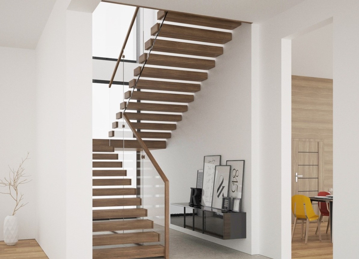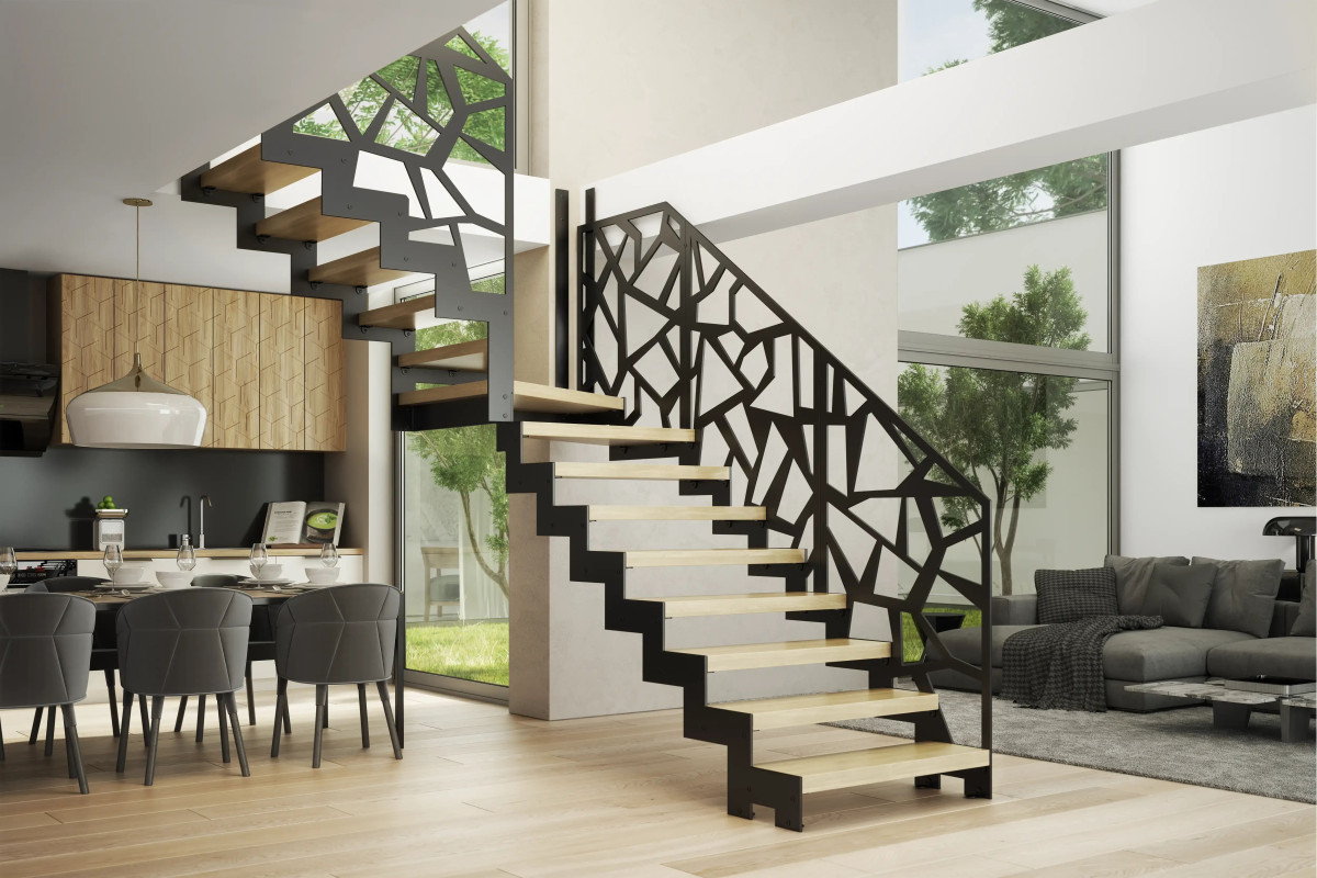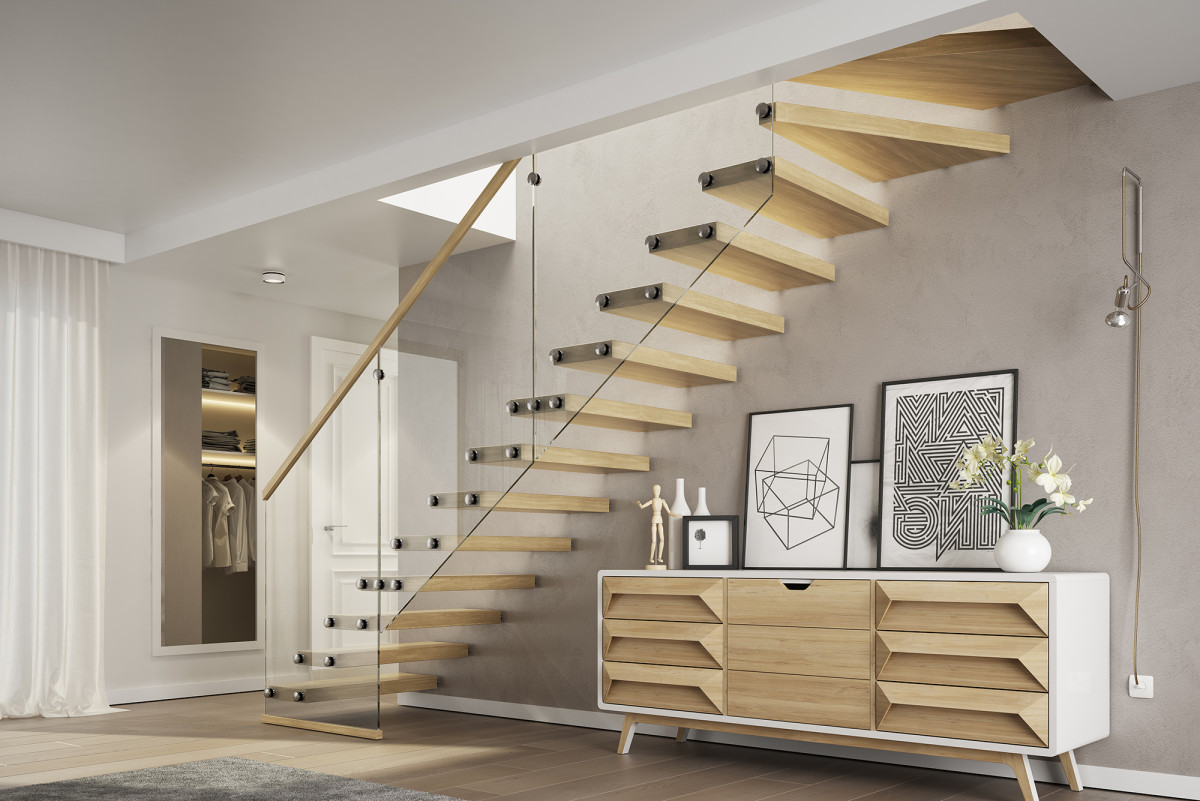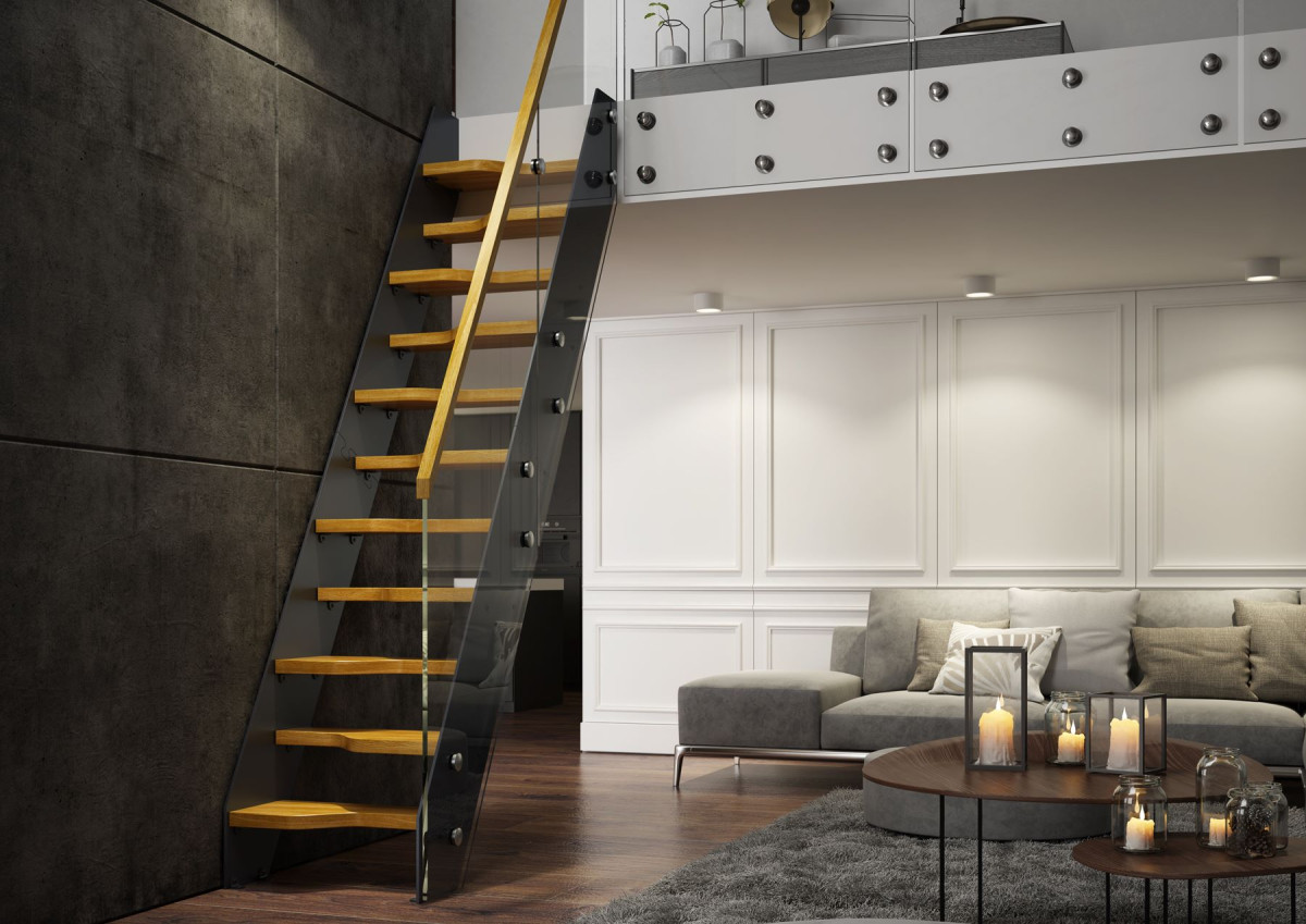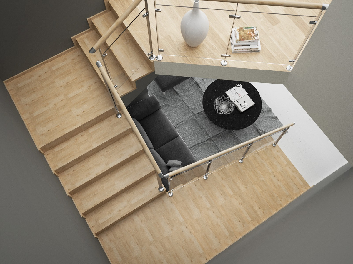 W tej nieco pragmatycznej aranżacji liczą się przede wszystkim lekkość i minimalizm. Cechy te zostają podkreślone ażurowymi stopniami bez podstopnic, które sprawiają wrażenie wychodzących ze ściany. Przestrzenny charakter podkreśla się także szklaną balustradą – z drewnianym pochwytem do wnętrz w stylu skandynawskim i pochodnych lub bez pochwytu do stylizacji loftowych czy industrialnych.