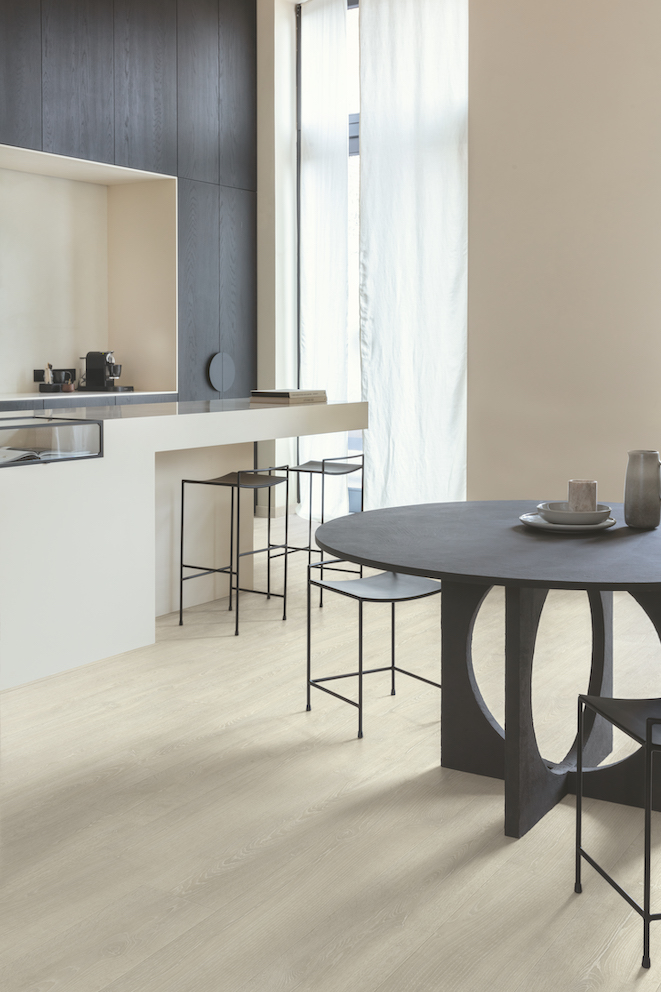 Podłogi laminowane Quick-Step idealnie oddają zarówno rysunek usłojenia, jak i nierówną strukturę rozmaitych gatunków drewna. Taki laminat ma wyczuwalne pod palcami chropowatości, tak charakterystyczne dla naturalnych materiałów. Co więcej, jest jak drewno ciepły i przyjemny dla stóp. Naprawdę trudno podłogi laminowane Quick-Step odróżnić od swoich drewnianych odpowiedników. Panele tej marki można położyć w każdym pomieszczeniu. Także w kuchni i łazience, co pozwala wzmocnić efekt przestronności wnętrza i nadać mu spójnego, loftowego charakteru. Dzięki zastosowaniu specjalnej powłoki hybrydowej „HydroSeal” są one odporne na rozlaną wodę, a jednocześnie – poprzez zastosowanie szczelnych zatrzasków – wodoszczelne. Z kolei technologia „Scratch and Stain Guard” uodparnia panele Quick-Step na uszkodzenia mechaniczne. Zyskujemy więc wszystkie zalety naturalnego materiału, i równocześnie większą wygodę użytkowania.