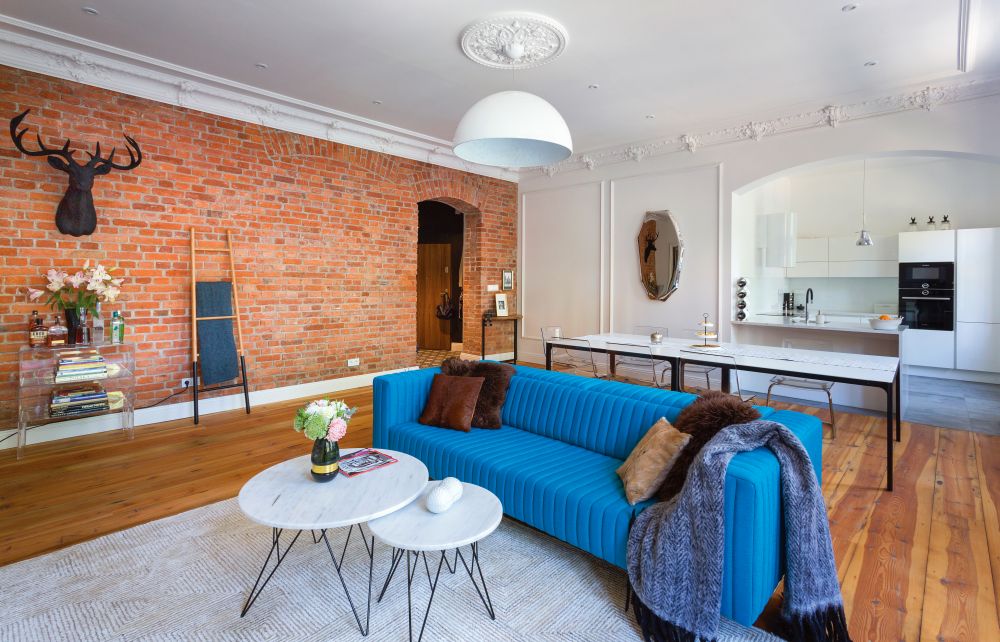 Prace budowlane polegały przede wszystkim za zmianie planu mieszkania poprzez wyburzenie niektórych ścian i wstawienie nowych. Dzięki temu możliwa była zmiana funkcji pomieszczeń. Ponadto zostały wymienione okna oraz stiuki, a drzwi i podłogę poddano renowacji. Zabytkowy parkiet, łukowe nadproża oraz ściany z czerwonej cegły podkreśliły historyczny charakter wnętrza. Podobny efekt dało zastosowanie stiuków i sztukaterii, które – przed długie lata niedoceniane – przeżywają swój renesans i są obecnie chętnie wybieranym detalem wykończeniowym nadającym wnętrzu indywidualny charakter. Elementy te zostały zestawione z nowoczesnymi, minimalistycznymi meblami. Wąska, stonowana gama kolorystyczna przełamana gdzieniegdzie mocnym akcentem sprawia, że wnętrze jest przejrzyste i przestronne, ale w żadnym wypadku nie monotonne. Pomimo połączenia pozornie skrajnie różnych stylów wygląda harmonijnie i spójnie.