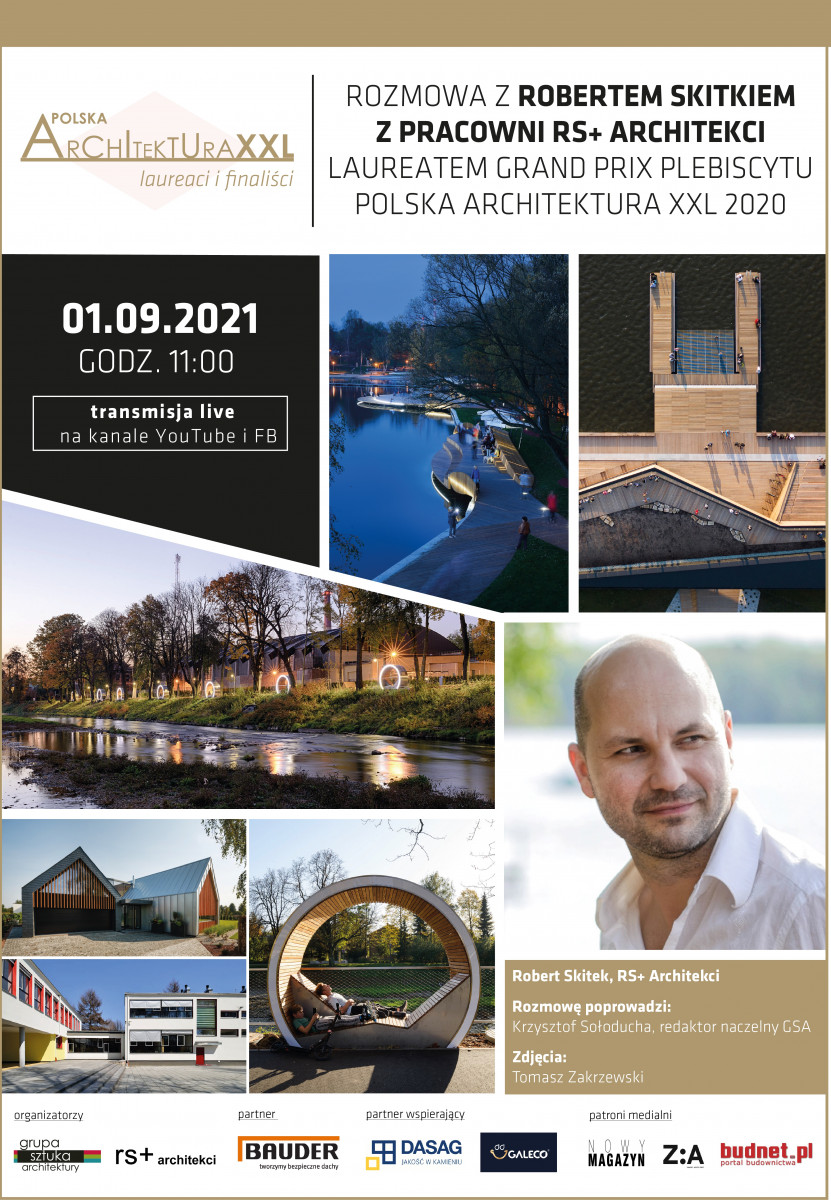21 maja 2021 odbyła się uroczysta gala trzynastej edycji Plebiscytu Polska Architektura XXL 2020, podczas której poznaliśmy laureatów konkursu. Nagrodę główną Grand Prix zdobyła przystań kajakarska MOSM nad jeziorem Paprocańskim w Tychach zaprojektowana przez pracownię RS+ architekci prowadzona przez Roberta Skitka. Zapraszamy na wywiad z architektem, który poprowadzi Krzysztof Sołoducha, redaktor naczelny GSA. Porozmawiamy o zwycięskiej realizacji, innych ciekawych projektach pracowni, stanie polskiej architektury i planach na przyszłość. Spotkanie otwiera cykl prezentacji online pt. Finaliści i laureaci Plebiscytu Polska Architektura XXL Widzimy się 1 września 2021 o godz. 11:00. Transmisja na kanale YT, FB i Lnkedin.