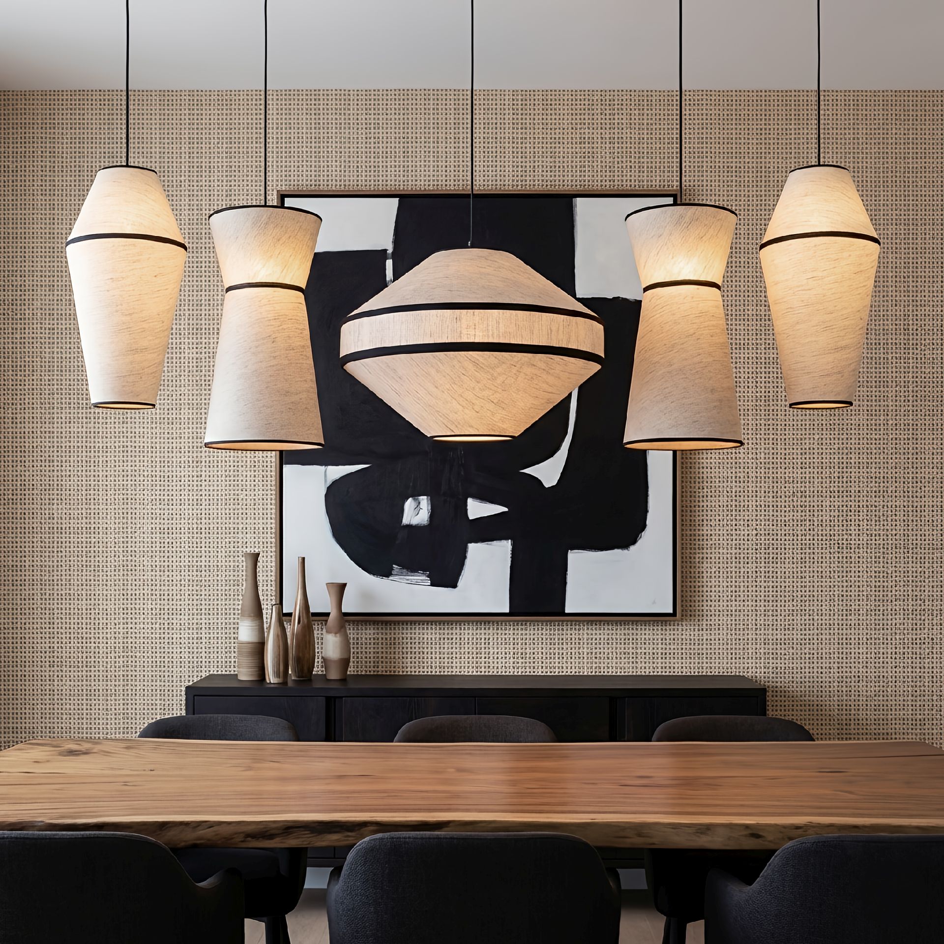 Lampy Amigo w grupie zyskują wyrazisty, architektoniczny charakter. Zawieszone rytmicznie kilka form świetlnych tworzy spójną instalację nad stołem – niemal rzeźbę światła. Naturalna baza z olejowanego drewna dębowego i lniane abażury o subtelnej fakturze wprowadzają ciepło i autentyczność. Miękkie światło rozprasza się równomiernie, tworząc przyjazną, intymną atmosferę. Amigo nie dominuje przestrzeni – porządkuje ją i nadaje rytm. W wersji pojedynczej staje się subtelnym, ale zdecydowanym akcentem, który przyciąga wzrok swoją formą i proporcją.