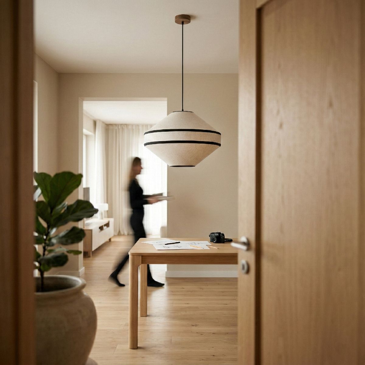 a odczuciem. Smukła sylwetka z litego drewna dębowego porządkuje wnętrze, nie przytłaczając go. To projekt ciszy, w którym światło i materiał współgrają, podkreślając organiczny charakter pomieszczenia. Lampa nie konkuruje z otoczeniem, lecz je współtworzy. Idealna do wnętrz, gdzie liczy się rytm dnia, gra światłocienia i naturalne materiały – od prywatnych salonów po kameralne, butikowe realizacje.