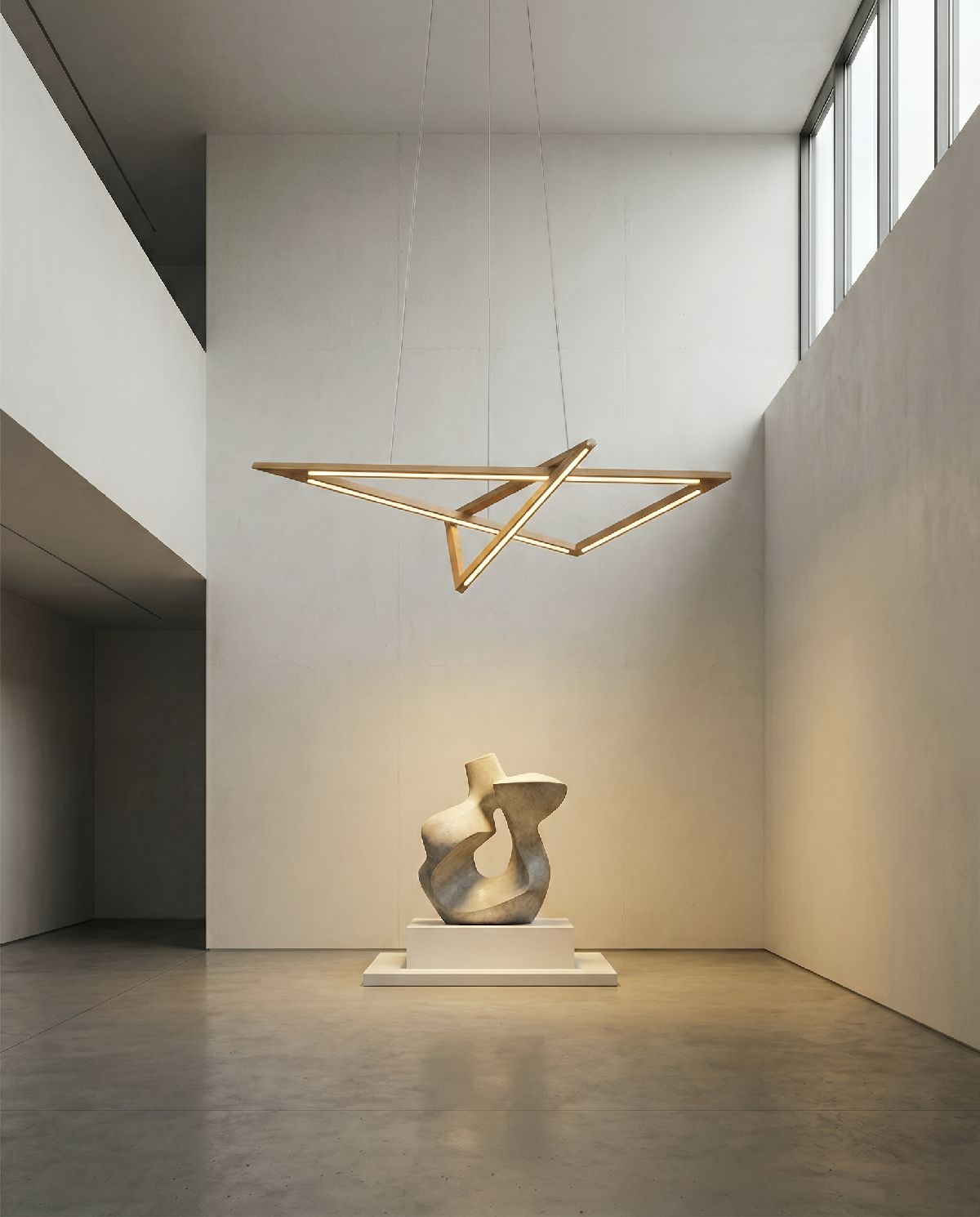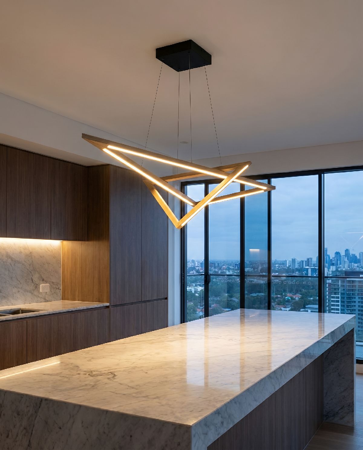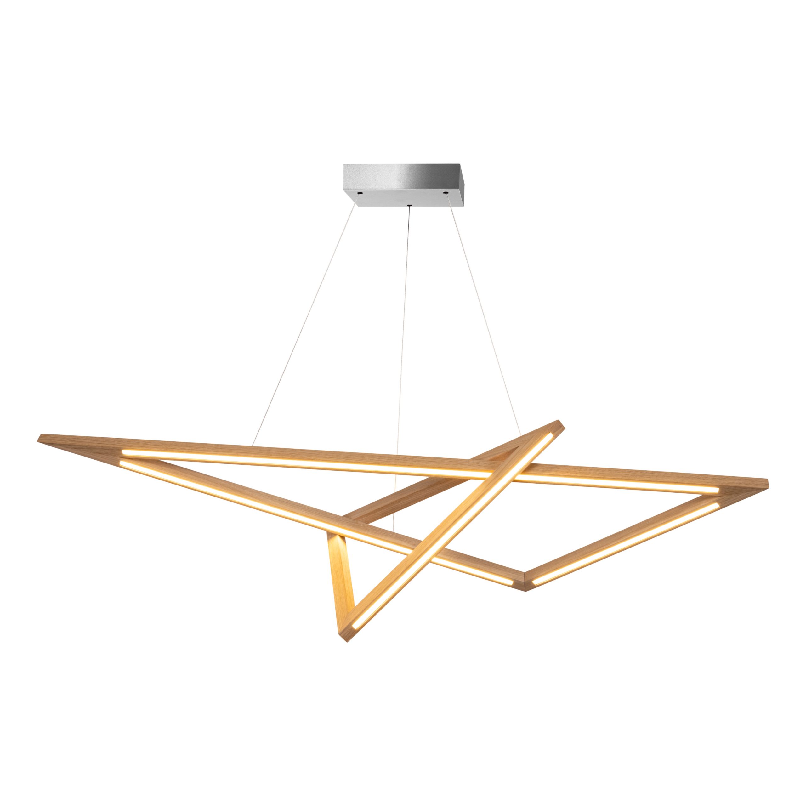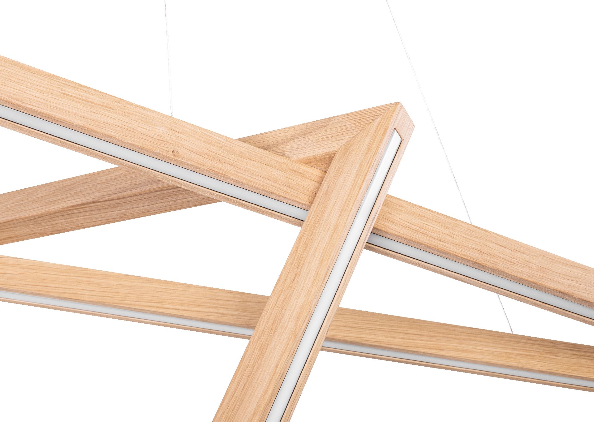 Vinci przesuwa oświetlenie z funkcji w stronę architektonicznej ekspresji. Trójkątne ramiona wykonane z drewna dębowego tworzą formę zmieniającą się w zależności od perspektywy, wprowadzając rytm i porządek wnętrza. W kuchni definiuje strefę wyspy, w przestrzeniach galeryjnych staje się niemal instalacją. Światło LED prowadzone wzdłuż krawędzi podkreśla konstrukcję, budując wieloplanowość i głębię. System Up&Down daje projektantom pełną kontrolę nad wysokością i układem lampy, pozwalając dopasować ją do funkcji, skali i proporcji wnętrza. Vinci nie jest dodatkiem – to element, który kształtuje przestrzeń i nadaje jej wyraz.