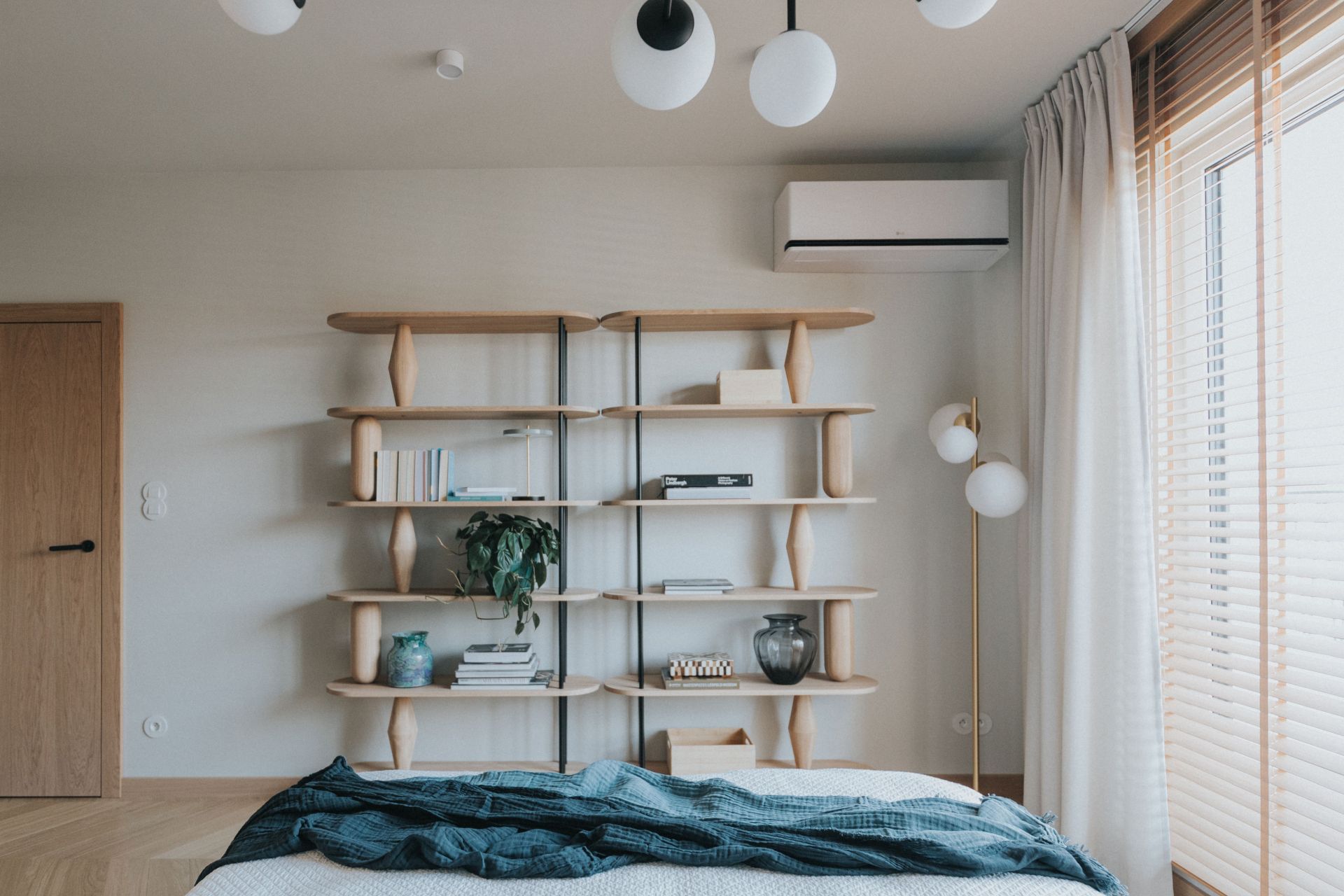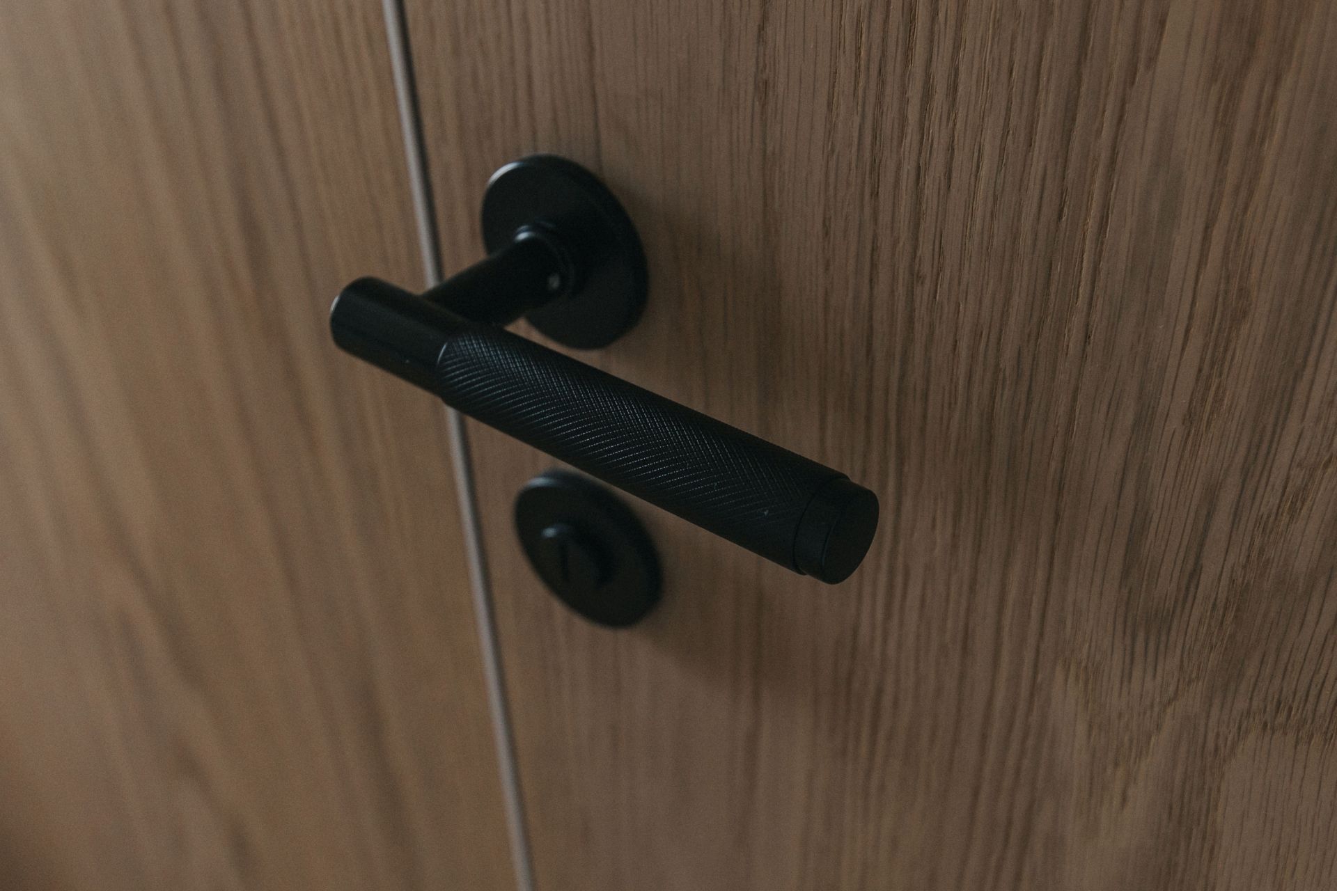 Wnętrze przemawia solidnym wzornictwem. Wygodne fotele z bukowymi, giętymi oparciami to flagowy produkt rodzimego Famega, za który poznańscy projektanci Pawlak i Stawarski otrzymali German Design Award. Gdyńskie studio Tamo Design stworzyło wyróżniające się formą regały i stoliki nocne. Zabudowa w strefie wejściowej została zaprojektowana z myślą o maksymalnej spójności i wizualnym porządku. W mieszkaniu zastosowano drzwi polskiej marki MORIC, zlicowane ze ścianą w fornirze dębowym, które niemal całkowicie wtapiają się w drewnianą okładzinę. Dzięki ukrytej ościeżnicy granica między ścianą a skrzydłem drzwi staje się ledwie zauważalna. To rozwiązanie chętnie stosowane przez MORIC, markę znaną z perfekcyjnego wykończenia i dbałości o detale stolarskie.