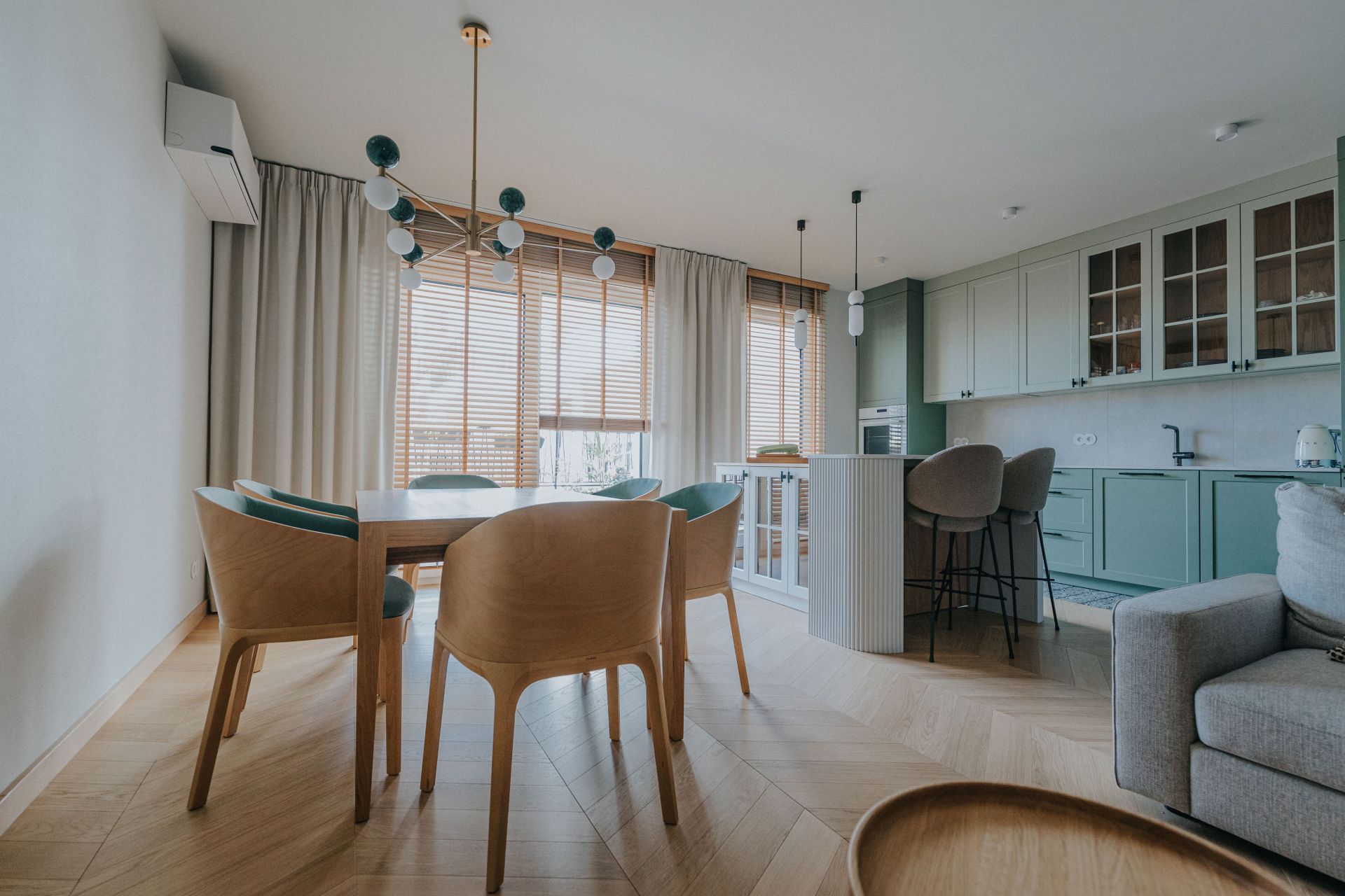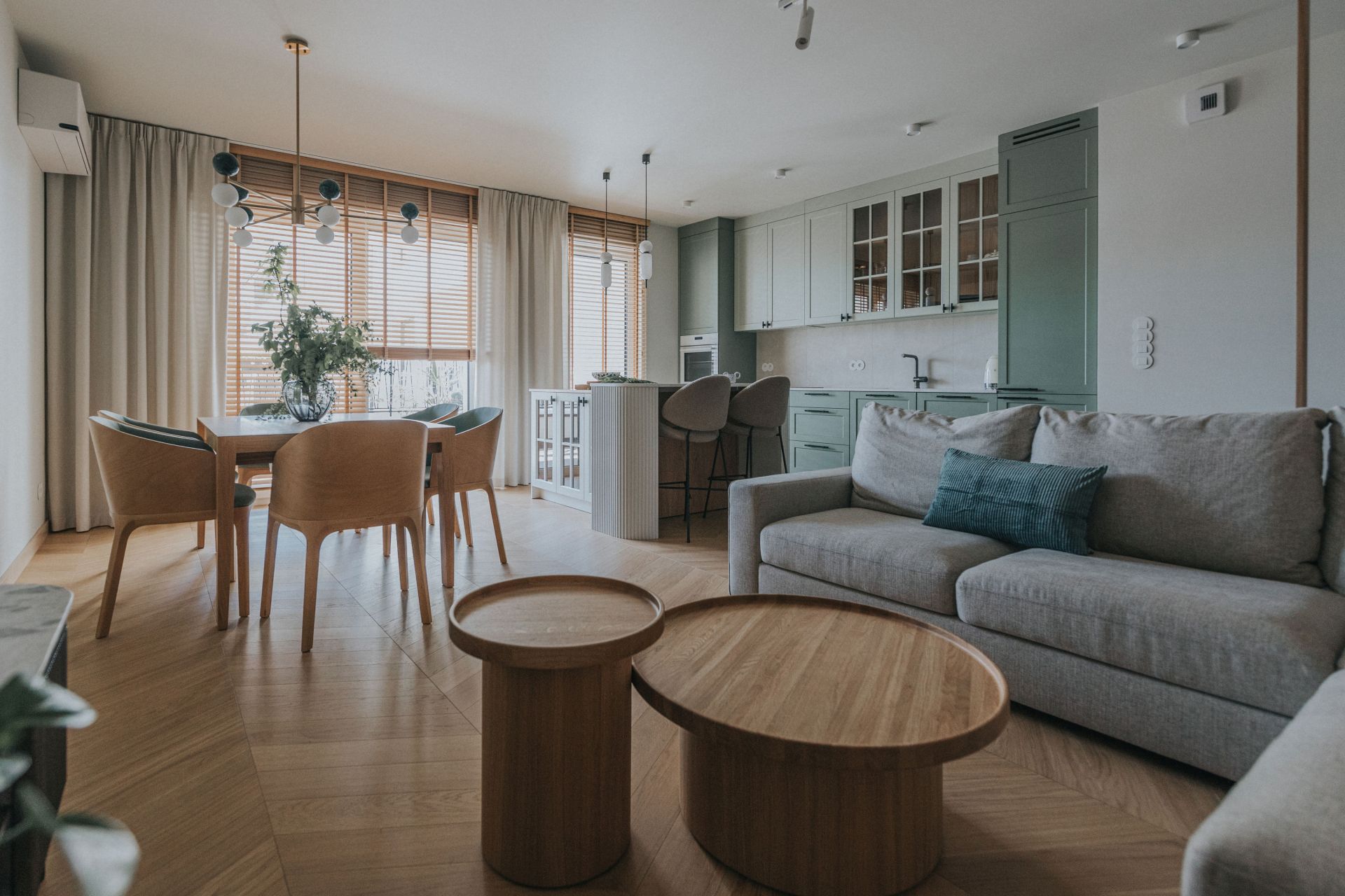 Motywem przewodnim w projektowanej przestrzeni uczyniono zieleń, która zagościła m.in. na ścianach podkreślonych strukturalnym tynkiem. Z części ścianek działowych zrezygnowano, by otworzyć przestrzeń salonu na kuchnię i jadalnię. Dzięki temu południowe słońce wlewa się bez ograniczeń przez balkon i dziedziniec z zabytkowymi platanami. We wnętrzu znajdziemy sporo naturalnego drewna. Dębowe forniry w specjalnie dobieranym piaskowym odcieniu pokrywają ściany i są składową zabudów. Na uwagę zasługuje też podłoga w postaci szczotkowanego i fazowanego parkietu, ułożonego we wzór jodełki węgierskiej.