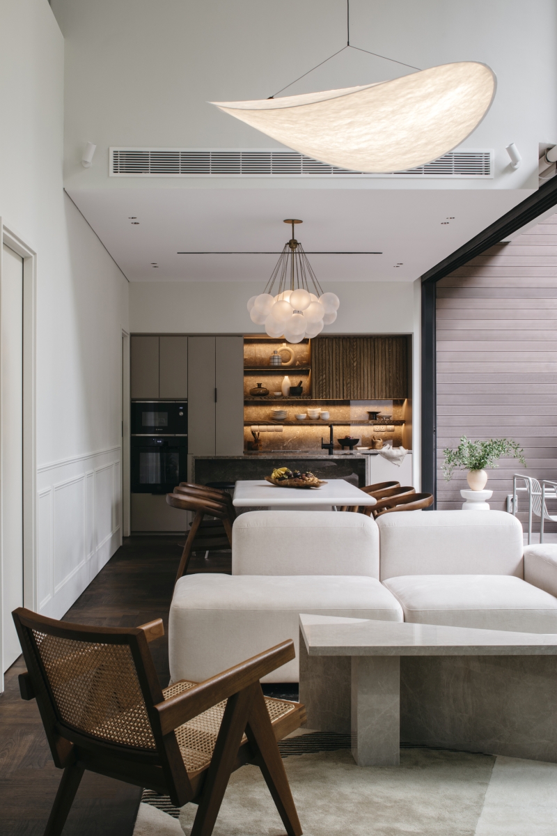 Apartament został zaprojektowany jako otwarta, płynna przestrzeń – pozbawiona ostrych granic i sztywnych podziałów, pozwalająca domownikom naturalnie odnajdywać własne miejsca i rytuały. Wnętrze nie narzuca jednego scenariusza użytkowania, lecz zmienia się wraz z codziennością mieszkańców, reagując na ich potrzeby, nastroje i sposób bycia razem. Spokojna, wyciszona narracja przestrzeni opiera się na naturalnych materiałach, subtelnych przejściach tonalnych i konsekwentnych decyzjach projektowych, które budują poczucie harmonii bez nadmiaru gestów. To dom, który nie konkuruje z życiem, ale delikatnie je porządkuje – oferując tło dla relacji, odpoczynku i wspólnych chwil. Architektura codzienności w najbardziej dojrzałej formie: cicha, uważna i ponadczasowa.