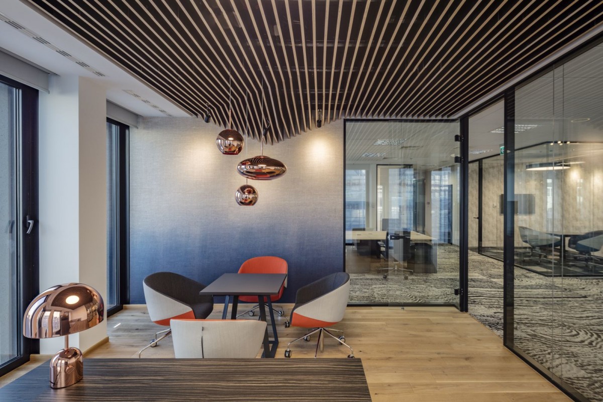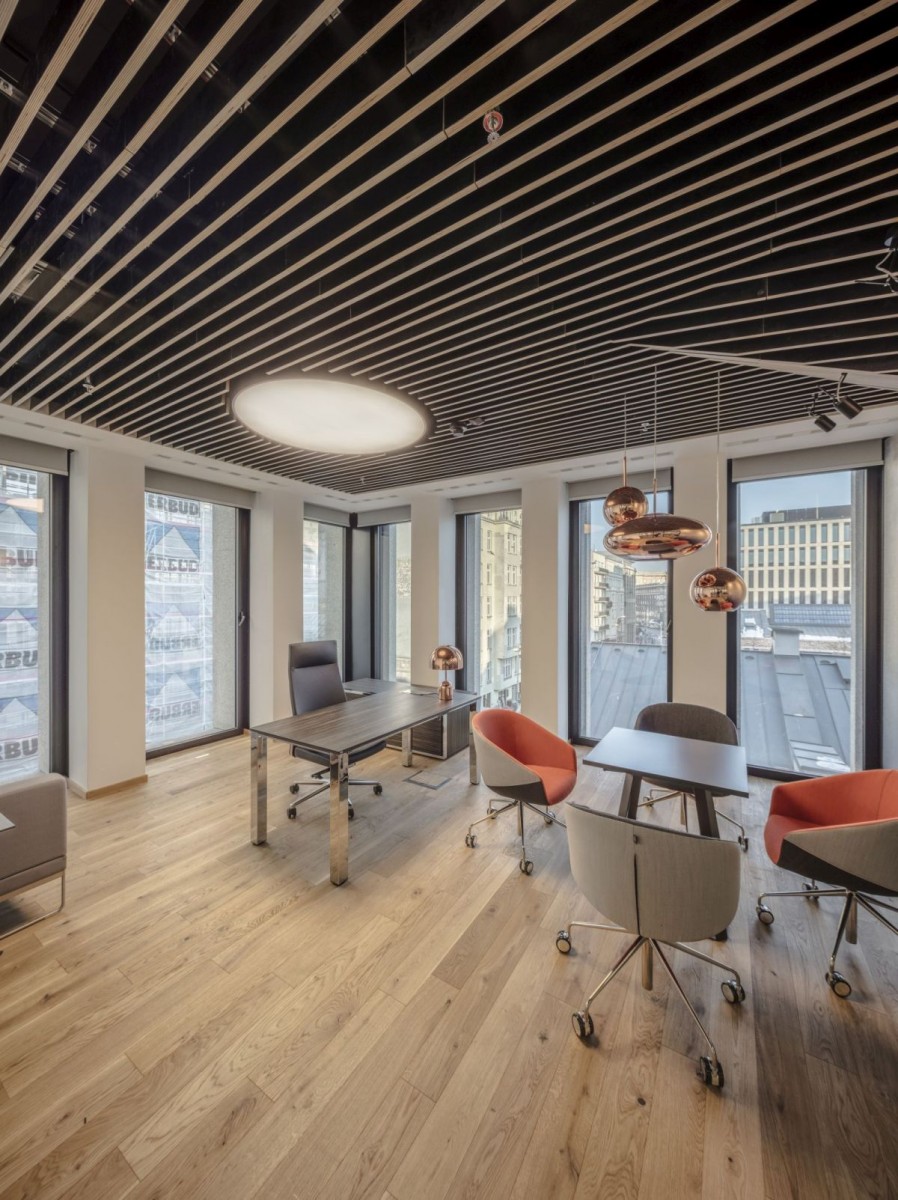 – Zamawiający ma ogromne wyczucie stylu i nie chciał „zwykłego biura”, co pozwoliło nam zastosować wiele ciekawych rozwiązań, takich jak geometryczne drewniane sufity, czy wykorzystane po raz pierwszy w Polsce wykładziny duńskiej marki Ege, zaprojektowane przez Toma Dixona – podkreśla Marlena Kwiatkowska.
