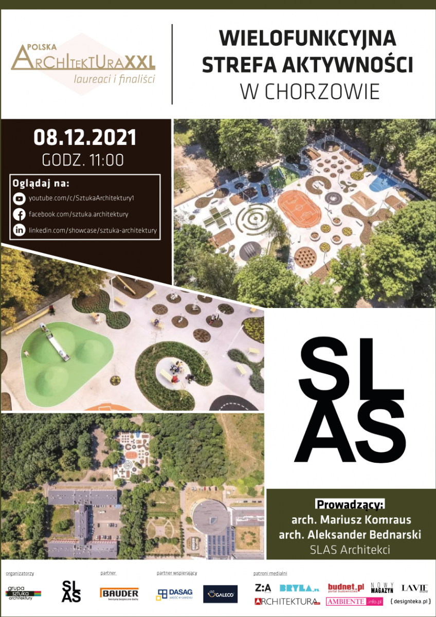 Strefa aktywności została zaprojektowana na terenie powstałym po wyburzeniu jednego z budynków garnizonu wojskowego i jest pierwszym krokiem włączania przestrzeni kampusu uniwersyteckiego w tkankę miejską Chorzowa. Zapraszamy na wywiad z autorami tej realizacji Aleksandrem Bednarskim i Mariuszem Komrausem z pracowni SLAS Architekci oraz prezentację przestrzeni w ramach cyklu Finaliści i laureaci Plebiscytu Polska Architektura XXL. Porozmawiamy o obiekcie, innych ciekawych projektach pracowni i planach na przyszłość. Widzimy się 8 grudnia 2021 o godz. 11:00. Transmisja na kanale YouTube, FB i LinkedIn.