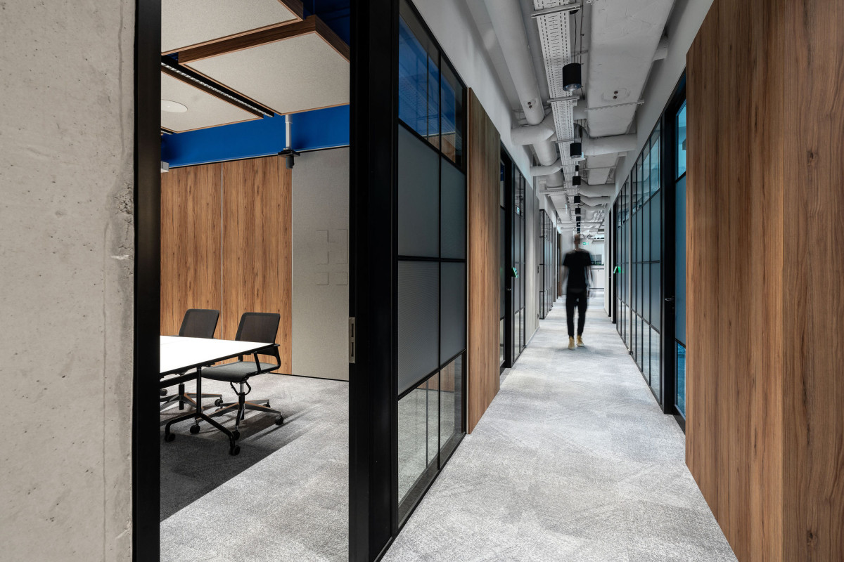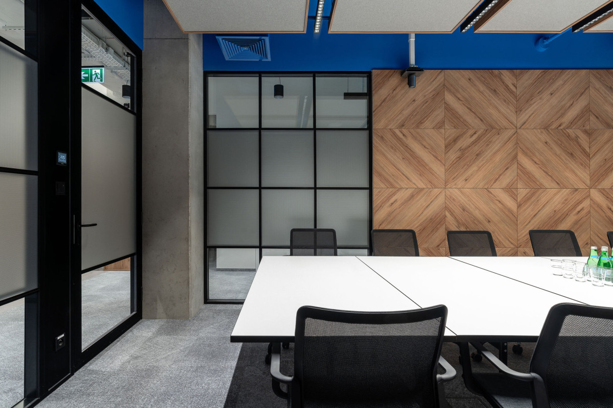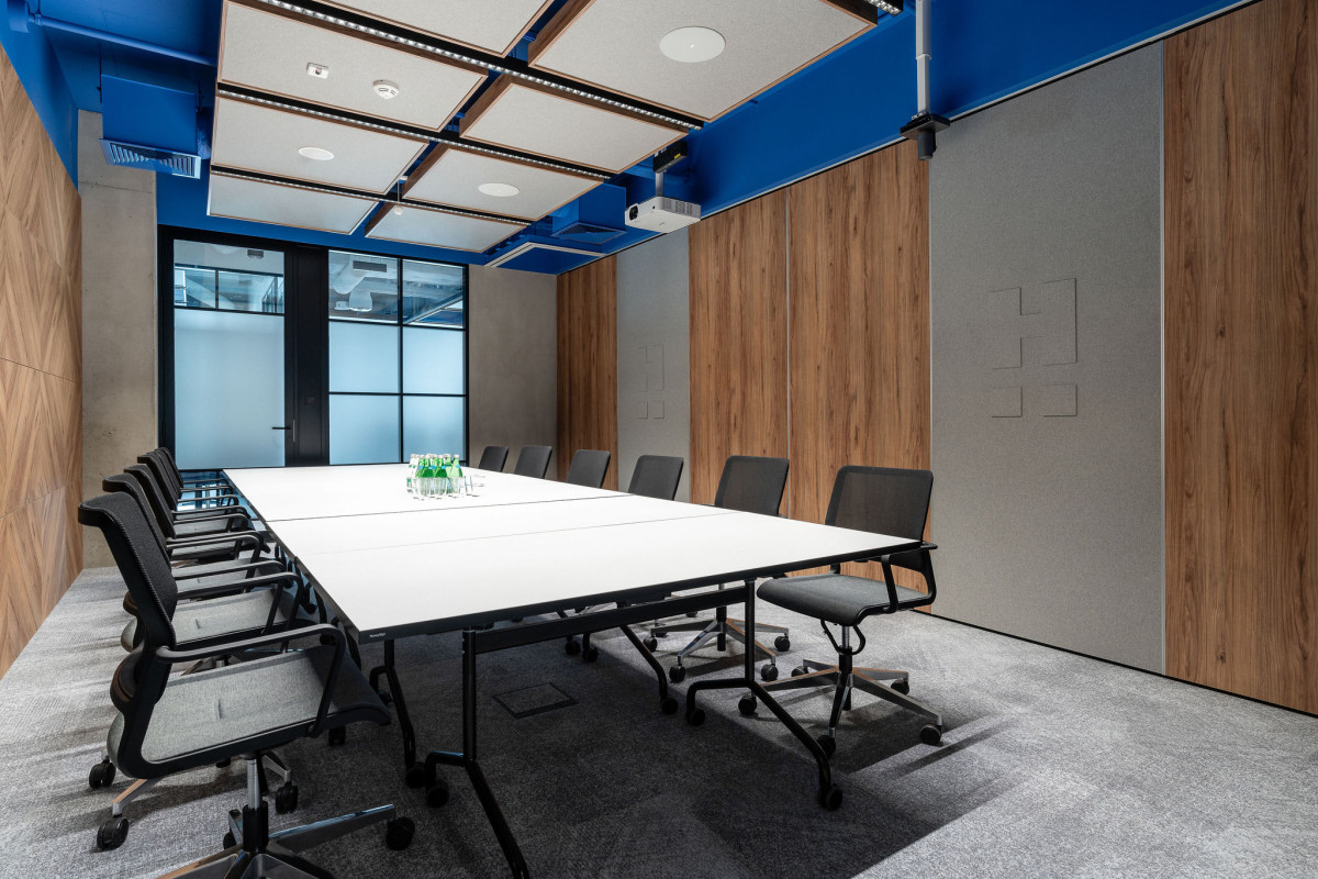 Na powierzchni biura znajdują się łącznie cztery sale spotkań, z których trzy można połączyć w jedną, uzyskując większą przestrzeń dla 20 osób. W tych pomieszczeniach również pojawia się kolor niebieski i zestawienie kolorystyczne drewna z szarością. Sufit jest powtórzeniem elementów z przestrzeni pracowniczych, jednak ze względu na mniejszy rozmiar sal, ograniczonych do wysp z paneli PET. W jednej z mniejszych salek na ścianie znajdziemy wycięte z dibondu symbole z karty graficznej Inwestora, które nawiązują do obszaru aktywności firmy, czyli branży mleczarskiej.