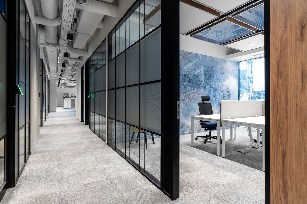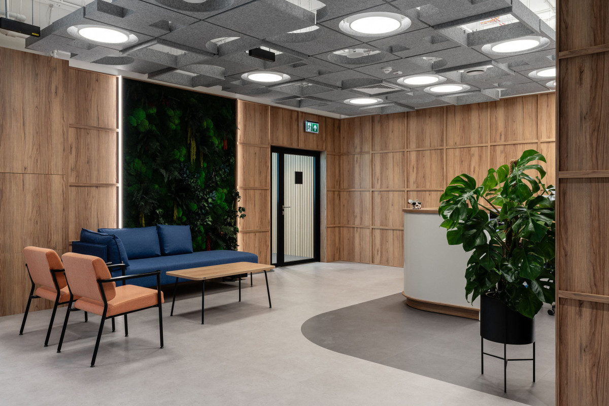 Część pracownicza z kolei, na którą składa się open space oraz pomieszczenia biurowe, to przede wszystkim jasne wnętrza, ocieplone drewnem, z kolorystycznymi akcentami w formie lakierowanej siatki cięto-ciągnionej na suficie czy kolorowych frontów lockerów. Przestrzenie te zróżnicowano poprzez dobranie innych wzorów tapet do gabinetów i do open space’ów. Całość wystroju uzupełnia duża ilość żywej zieleni w wolnostojących oraz stojących na szafkach donicach.