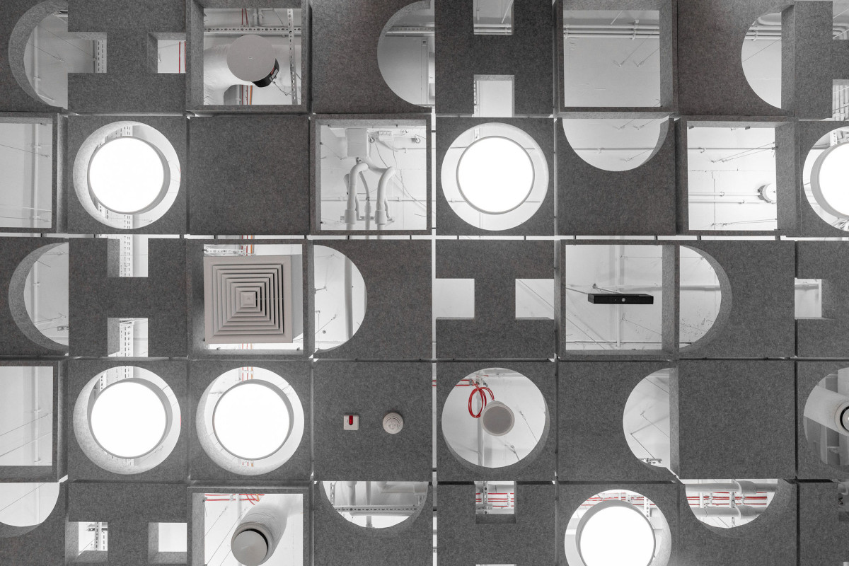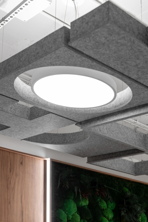 Jak podkreśla sam architekt, to właśnie projekt sufitów jest elementem, który zasługuje tu na szczególną uwagę. W strefie wejścia oraz w jednej z sal konferencyjnych znajdziemy akustyczny sufit wykonany na zamówienie przez firmę Nyquista. Prostopadłościenne elementy z materiału typu PET tworzą ciekawą kompozycję naprzemiennie ułożonych pudełek z wycięciami o różnych kształtach – litery „H” nawiązującej do logotypu firmy, kwadratów, okręgów z miejscem na oprawę oraz półkoli. W pomieszczeniach biurowych, w przestrzeniach typu open space oraz pozostałych salach spotkań z kolei zaprojektowano sufit również wykonywany według indywidulnego projektu, tym razem przez firmę Morrow Woods. Są to wyspy sufitowe z siatki cięto-ciągnionej lakierowanej na kolor niebieski oraz wyspy drugiego rodzaju z paneli PET. Obydwie wersje wysp wykończone są laminowaną listwą obwodową w kolorze drewnopodobnym Swiss Krono Dąb Pradawny – takim samym jak na ścianach czy części zabudów meblowych. Dla podkreślenia tych nietypowych elementów i wyciszenia tła strop wraz z instalacjami został pomalowany na kolor biały. Pomiędzy wyspami podwieszone zostały czarne oprawy liniowe w rozmiarze poszczególnych grup wspomnianych wysp.
