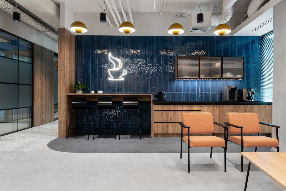 Na uwagę zasługuje także pomieszczenie socjalne z aneksem kuchennym. Jego kolorystyka oraz materiały wykończeniowe pomieszczenia również nawiązują do klimatu całości aranżacji. – W kuchni utrzymaliśmy prostą posadzkę oraz otwarty sufit, gdzie jedynie strop pomalowany jest na biało. W zabudowie kuchennej uwagę przyciągają granatowe płytki o różnorodnym wybarwieniu i fronty ze szkła ryflowanego. Z kolei na dwóch przeciwległych ścianach charakterystycznym punktem są dekoracyjne kinkiety umieszczone w osiach okładziny drewnopodobnej. W ten sposób miejsce to staje się mniej formalnym, a jednak ciągle utrzymanym w tej samej tonacji stylistycznej, punktem spotkań pracowników – podsumowuje arch. Jakub Bubel.