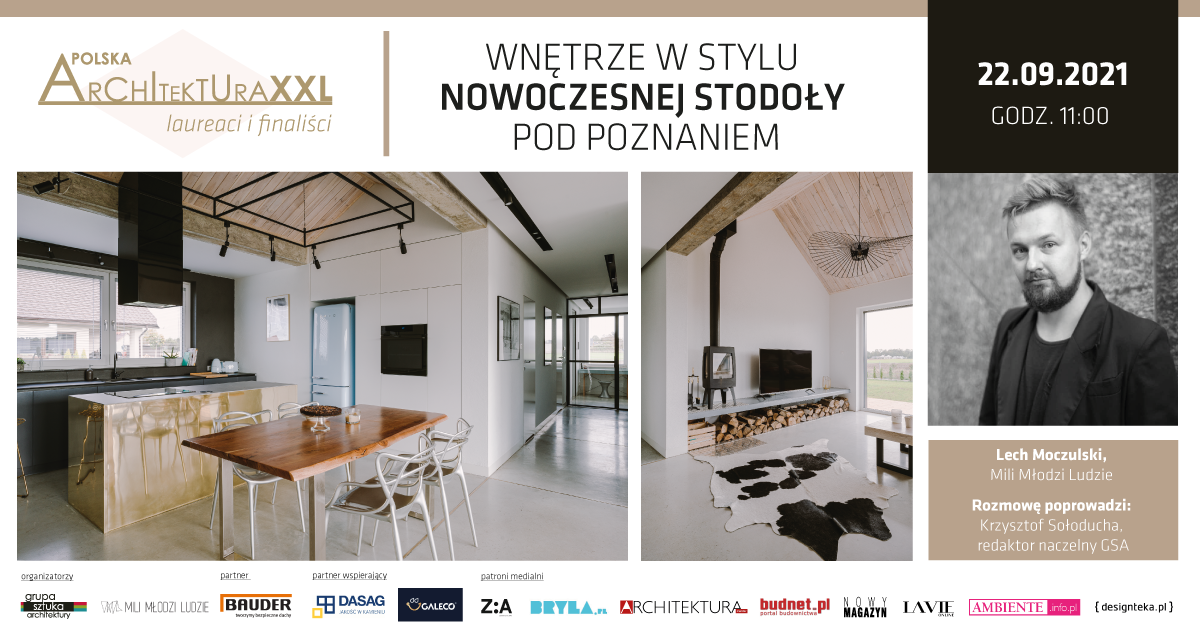 Dom, którego wnętrza zaprojektowano w stylu nowoczesnej stodoły, mieści się pod Poznaniem. Za projekt odpowiedzialna jest pracownia Mili Młodzi Ludzie, która znana jest z klimatycznych aranżacji i pełnych smaku pomysłów. Nie inaczej było i tym razem – architekci zamknęli we wnętrzu domu sielskiego ducha, proponując jednocześnie bardzo współczesne wzornictwo i rozwiązania stylistyczne. Zapraszamy na wywiad z Lechem Moczulskim z pracowni Mili Młodzi Ludzie oraz prezentację wnętrza w ramach cyklu Finaliści i laureaci Plebiscytu Polska Architektura XXL. Porozmawiamy o realizacji, innych ciekawych projektach pracowni i planach na przyszłość. Widzimy się 22 września 2021 o godz. 11:00. Transmisja na kanale YouTube, FB i LinkedIn.