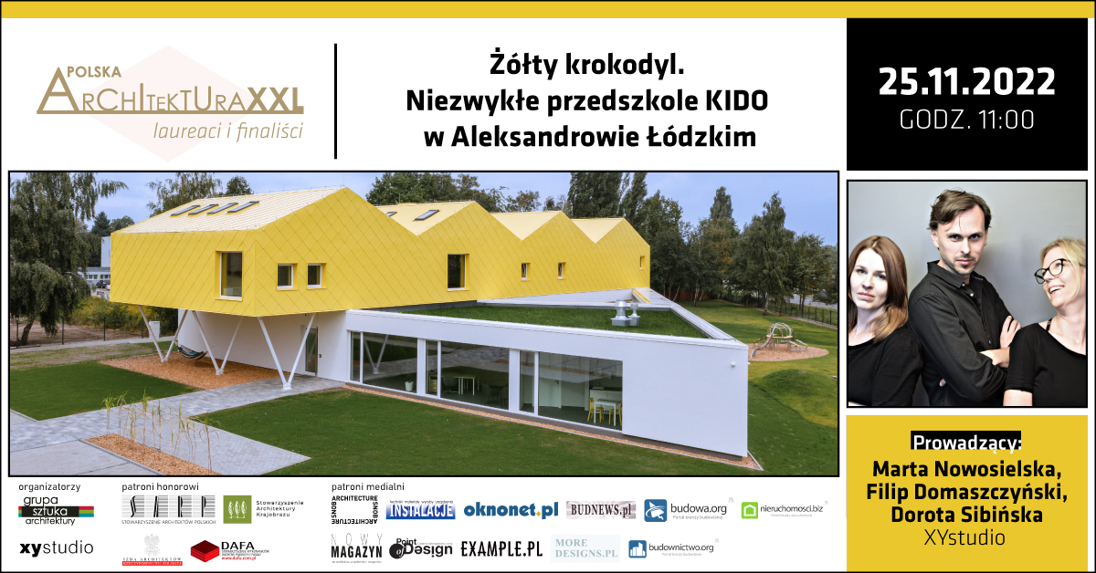 Żółty krokodyl – to właśnie widzą w tej bryle dzieci. Dorośli dostrzegają w pilastym dachu echo fabrycznych zabudowań Łodzi. Tak naprawdę przedszkole KIDO w Aleksandrowie Łódzkim to technologiczna hybryda. Parter budynku jest murowany, natomiast piętro zostało wykonane w technologii CLT. Zapraszamy na prezentację projektu w ramach cyklu Finaliści i laureaci Plebiscytu Polska Architektura XXL oraz wywiad z twórcami przedszkola pracownią xystudio, którzy opowiedzą o realizacji, swojej pracowni, ciekawych projektach i planach na przyszłość. Widzimy się 25 listopada 2022 o godz. 11:00. Zapisz się już teraz.