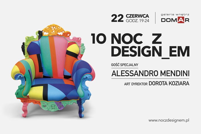 Gwiazdy światowego designu i czołowi polscy projektanci zaprezentują swoje prace podczas 10. Nocy z Designem, która odbędzie się 22 czerwca w Galerii Wnętrz DOMAR we Wrocławiu. Tegoroczna jubileuszowa edycja jest wyjątkowa. Gościem Specjalnym będzie mistrz światowego designu Alessandro Mendini a roli Art Dyrektora podjęła się Dorota Koziara – wybitna polska projektantka od lat pracująca w Mediolanie.