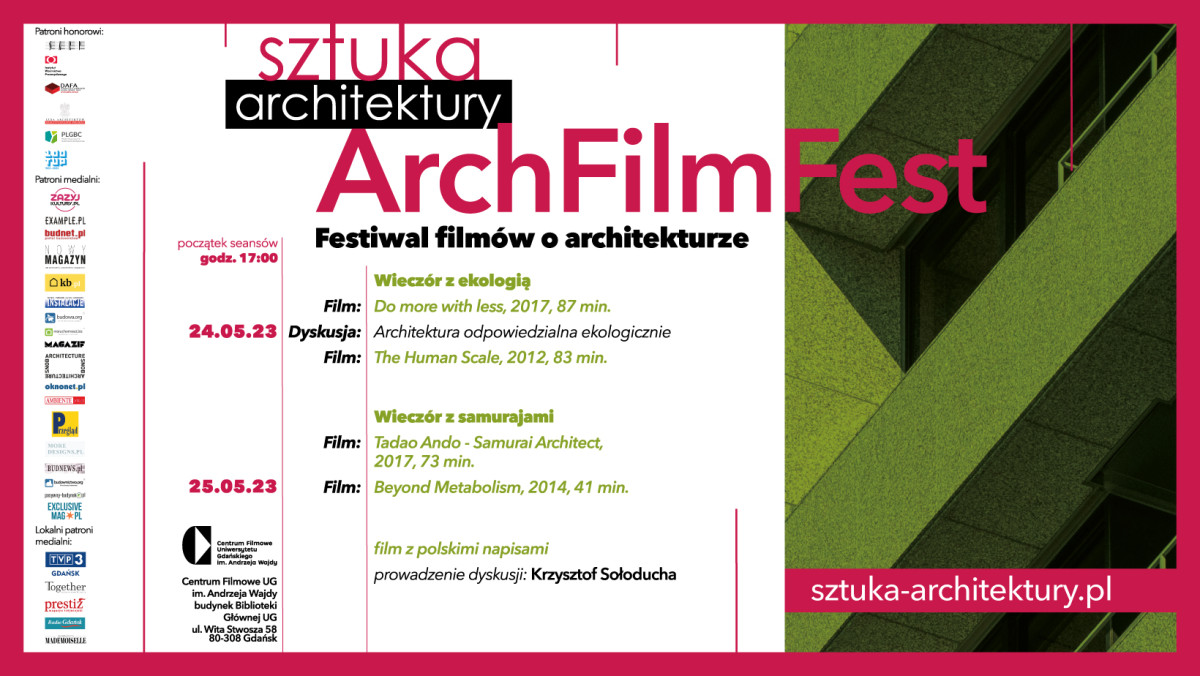 Festiwal Filmów o Architekturze ArchFilmFest zawita tym razem do Gdańska. Program pokazów i dyskusji dotyczyć będzie m.in. wyzwań środowiskowych, które są jednym z najważniejszych zagadnień z jakim musi mierzyć się współczesna architektura i budownictwo. Poruszymy również temat japońskiej architektury, która niesie ze sobą inspiracje tradycyjnym, japońskim budownictwem drewnianym oraz prostotę. Festiwal odbędzie się w dniach 24-25 maja 2023, start godz. 17:00 w Centrum Filmowym UG im. Andrzeja Wajdy, budynek Biblioteki Głównej UG, ul. Wita Stwosza 58.