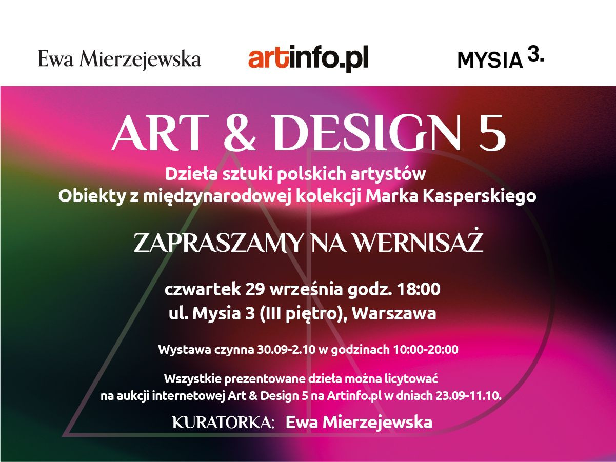 Aukcja Art & Design na Artinfo.pl organizowana jest po raz piąty. Jej kuratorką i główną organizatorką jest Ewa Mierzejewska. Tym razem na aukcję wybrała 87 obiekty, w tym 64 dzieła tradycyjnie rozumianej sztuki – głównie obrazy, ale w ofercie znajdziemy też grafikę, rzeźbę i rysunek. Do współpracy kuratorka zaprosiła Marka Kasperskiego, twórcę galerii Artkomis.pl, kolekcjonera sztuki pop-kultury, którego zbiory pokazywane były m.in. na Independent Collectors czy w Forbes. Marek Kasperski na aukcję Art & Design 5 przeznaczył 23 obiekty stanowiące przekrój jego zainteresowań: memorabilia, animation art, sztukę użytkową i bootleg toys – a to tylko niewielki fragment jego ogromnej kolekcji.