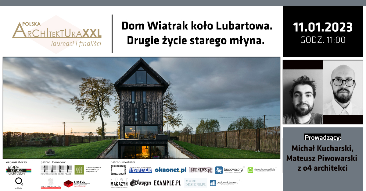 Zarys projektu zrodził się w głowach architektów, kiedy brali udział konkursie na Współczesny Dom Wiejski w 2014. Koncepcja została dostrzeżona po latach przez Inwestora z Lubelszczyzny, który wszedł w posiadanie zabytkowego młyna z wiatrakiem i postanowił przerobić go na dom mieszkalny. Tak powstał Dom Wiatrak będący niegdyś stałym elementem wiejskiego krajobrazu teraz zyskał nowe życie. Zapraszamy na prezentację zwycięskiego projektu domu w kategorii obiekty prywatne w głosowaniu jury Plebiscytu Polska Architektura XXL 2021 w ramach cyklu Finaliści i laureaci Plebiscytu Polska Architektura XXL. Porozmawiamy z autorami projektu Mateuszem Piwowarskim z o4 architekci i Michałem Kucharskim o tej realizacji, swojej pracy i planach na przyszłość. Widzimy się 11 stycznia 2023 o godz. 11:00. Zapisz się już teraz.