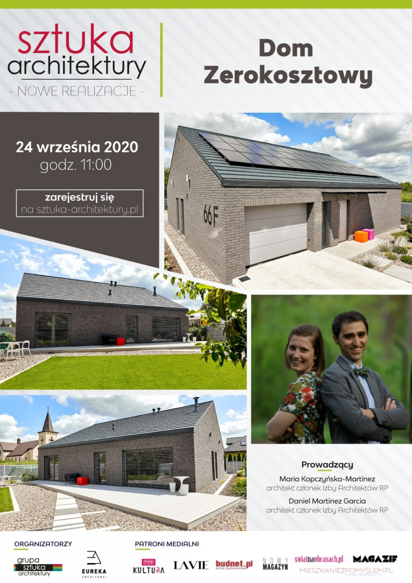 Nowe realizacje to już stały cykl prezentacji online organizowany przez Grupę Sztuka Architektury. Tym razem zapraszamy na wirtualny spacer po Domu Zerokosztowym zaprojektowanym przez pracownię Eureka Architekci. W tej realizacji nic nie jest przypadkowe, każda forma i rozwiązanie służą wspólnemu celowi: maksymalnemu obniżeniu kosztów utrzymania domu. Spotkanie odbędzie się 24 września 2020 o godz. 11:00, poprowadzą go autorzy projektu: Maria Kopczyńska-Martinez oraz Daniel Martinez Garcia. Zapraszamy do rejestracji.
