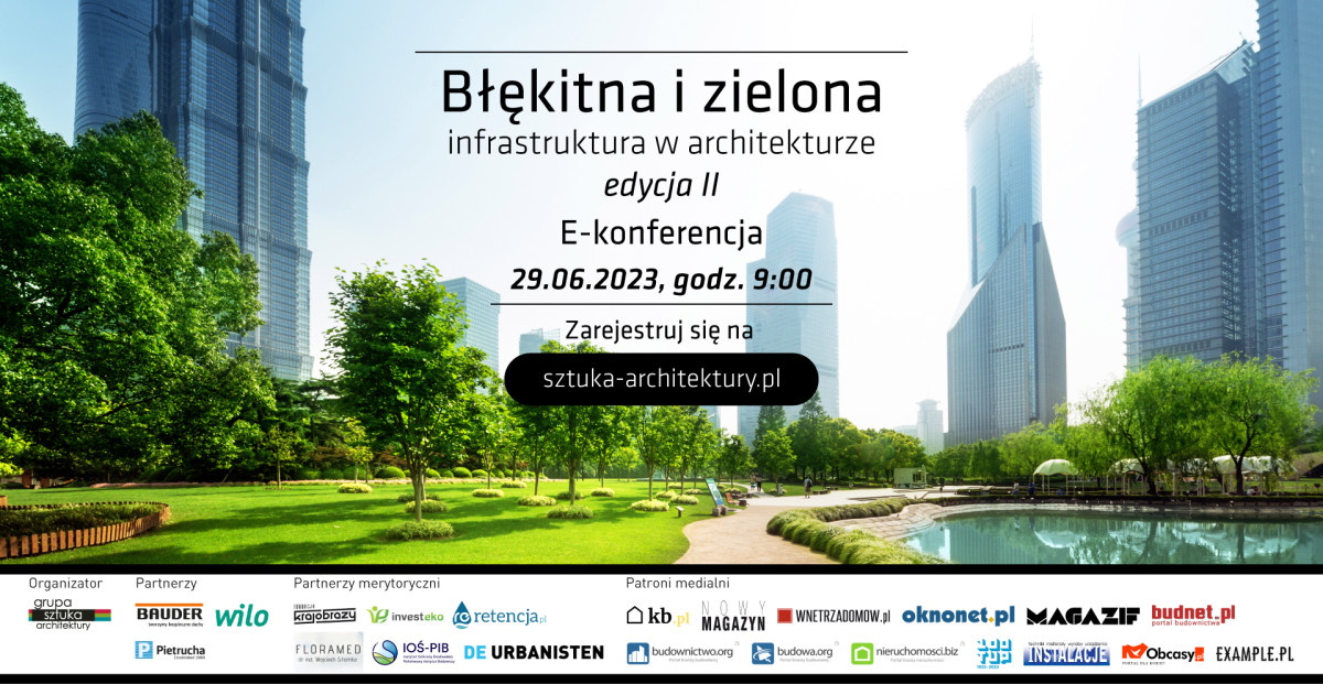 Intensywny rozwój miast wywiera coraz silniejszy wpływ na środowisko niezurbanizowane. Jednocześnie miasta i ich mieszkańcy stają przed rosnącą skalą wyzwań, takich jak zanieczyszczenie powietrza, występowanie miejskiej wyspy ciepła, nadmiar lub niedobór wody czy utrata naturalnych siedlisk. Wprowadzając elementy błękitno-zielonej infrastruktury w postaci zielonych dachów i fasad, pojemników retencyjnych, ogrodów deszczowych, nawierzchni przepuszczalnych, powierzchni strukturalnych, systemów OZE czy systemów zrównoważonej gospodarki wodą deszczową, miasta mogą przyczyniać się do ograniczenia skutków zmian klimatu oraz redukcji emisji gazów cieplarnianych. W trakcie naszej e-konferencji porozmawiamy o tym, jak te wymogi połączyć z nowoczesną architekturą i jakie wyzwania stawiają one przed projektantami. Widzimy się 29 czerwca 2023 o godz. 9:00. Aby wziąć udział w spotkaniu wystarczy zarejestrować się.